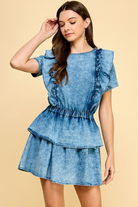 Short sleeve denim dress with accented ruffles along the seam. Elastic waistline and tiered ruffled skirt. Model Size + Fit: Model height: 5'10" Dress size: 2 Bust: 33 Waist: 24 Hips: 34