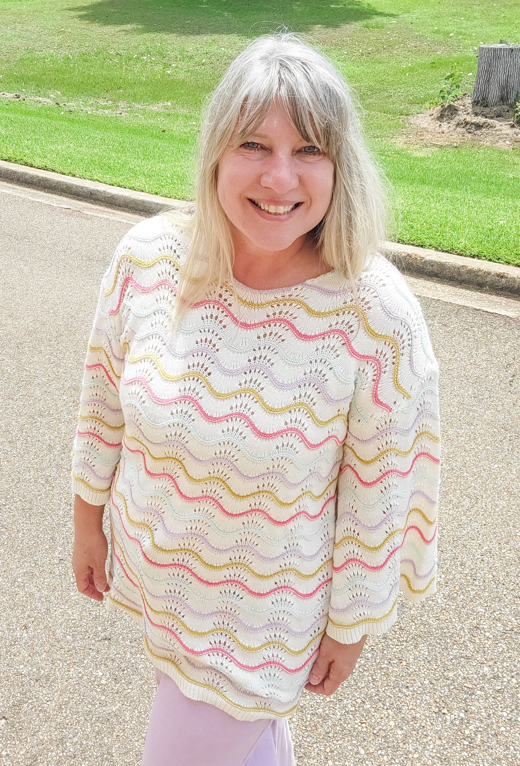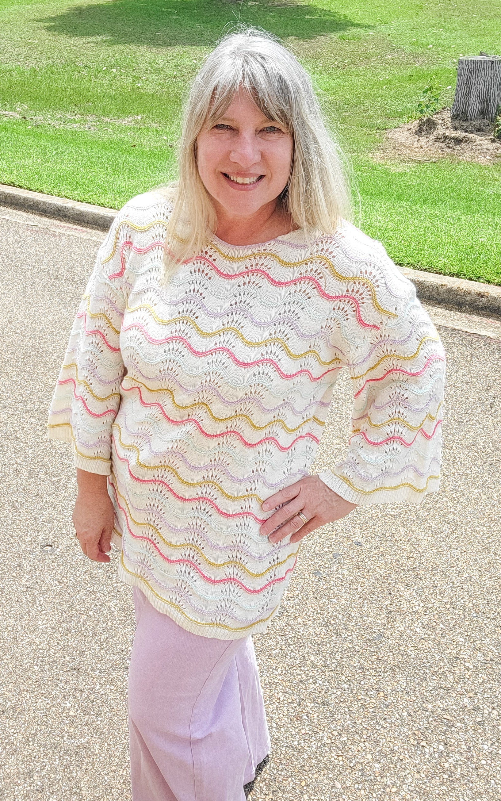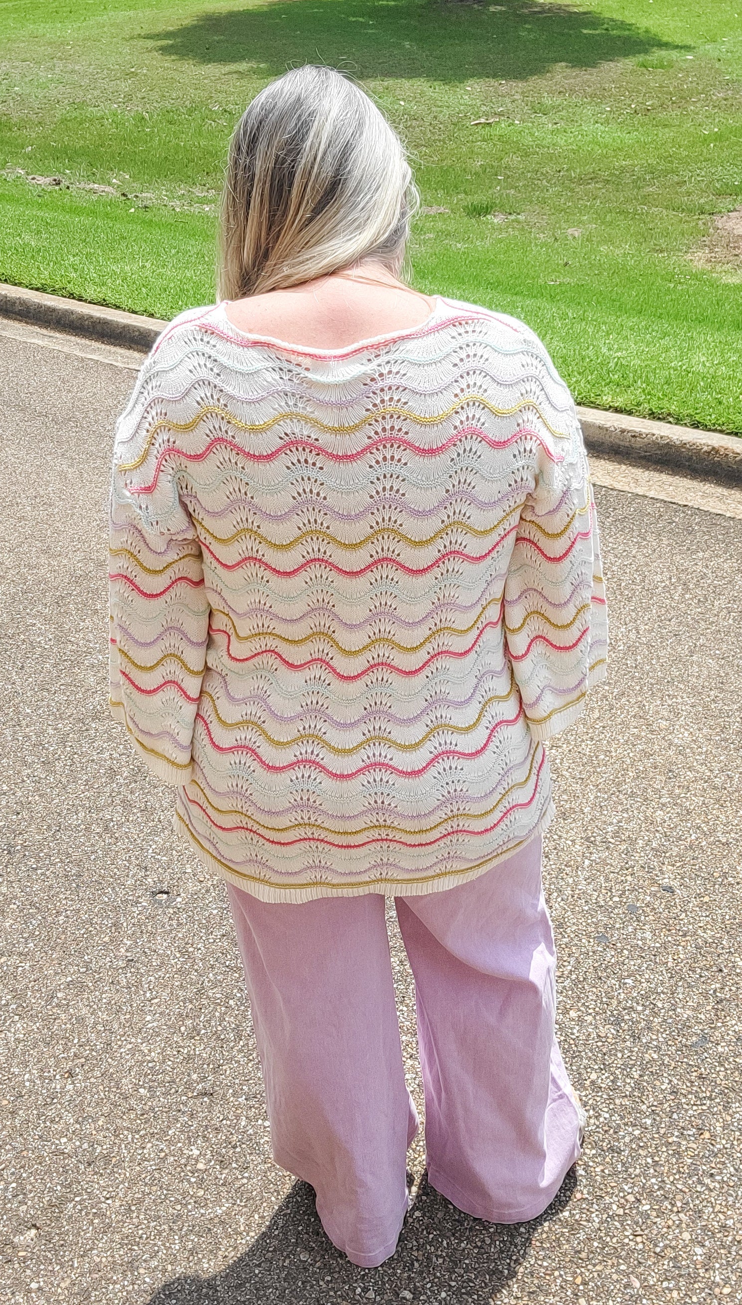 Indulge in the colorful and free-spirited style of our Over the Rainbow Crochet Dress! This open knit cover up dress boasts a playful wavy design and features a scoop neckline, ribbed bell sleeves, and hemline for ultimate comfort and style. Available in sizes small to large.