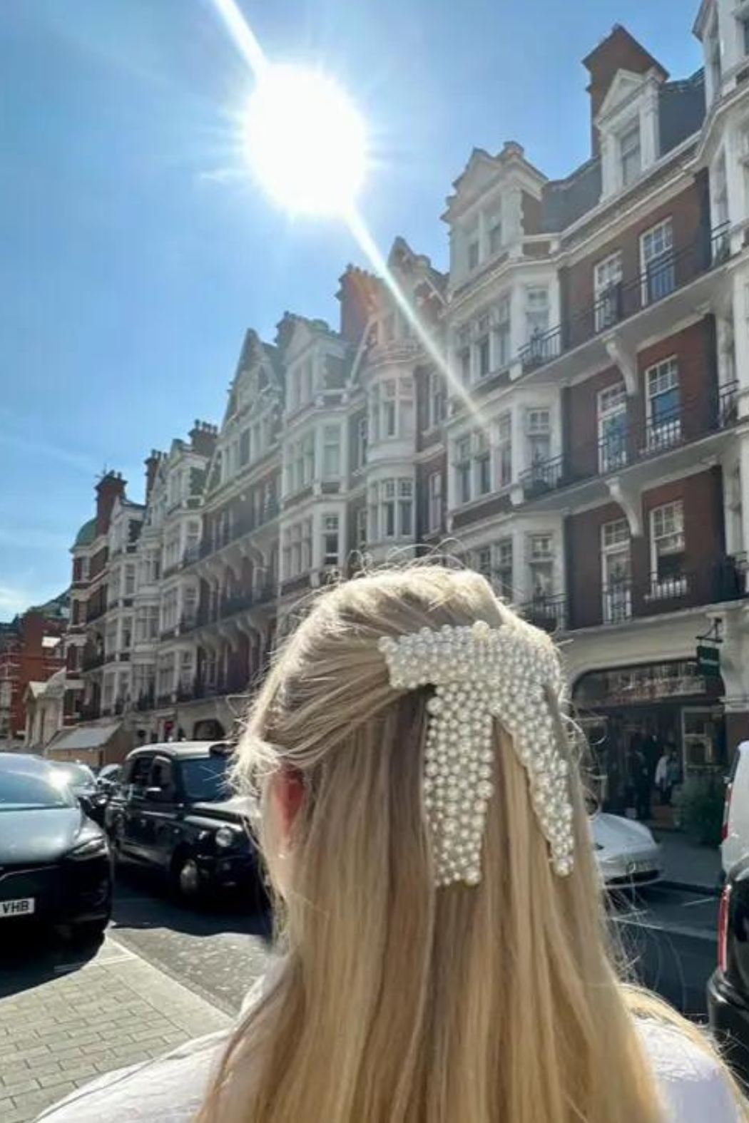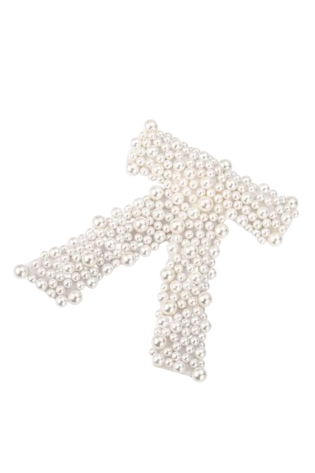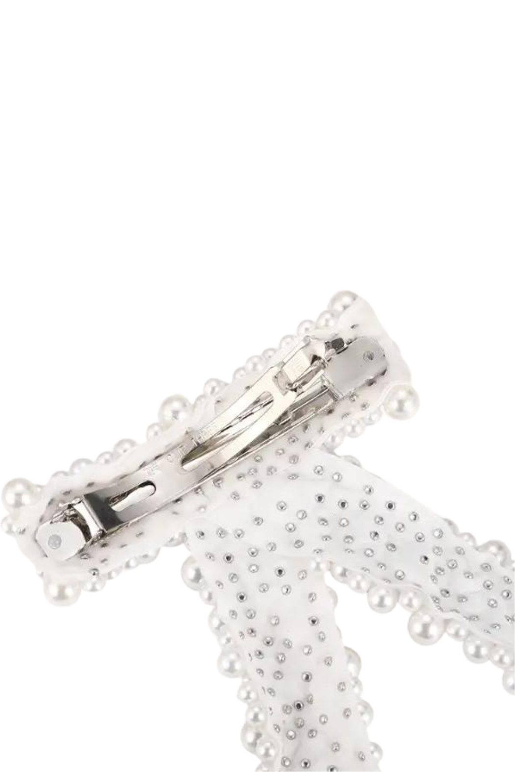Each hair clip is sewn by hand with meticulously embroidered vegan pearls and metallic beads. It features a versatile French barrette closure, for effortless styling.