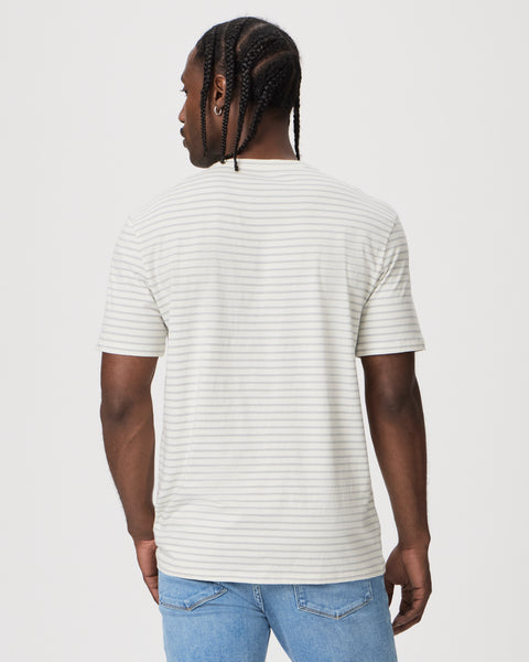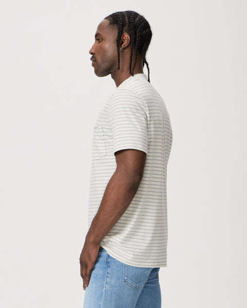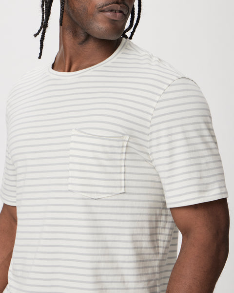 Introducing the Paige Ramirez Tee - Morning Riptide. Made from soft, stretchy cotton, this vintage-style crew neck tee features a unique pigment washed design with a raw edge pocket and curved hem. Perfect for a laid-back weekend look.