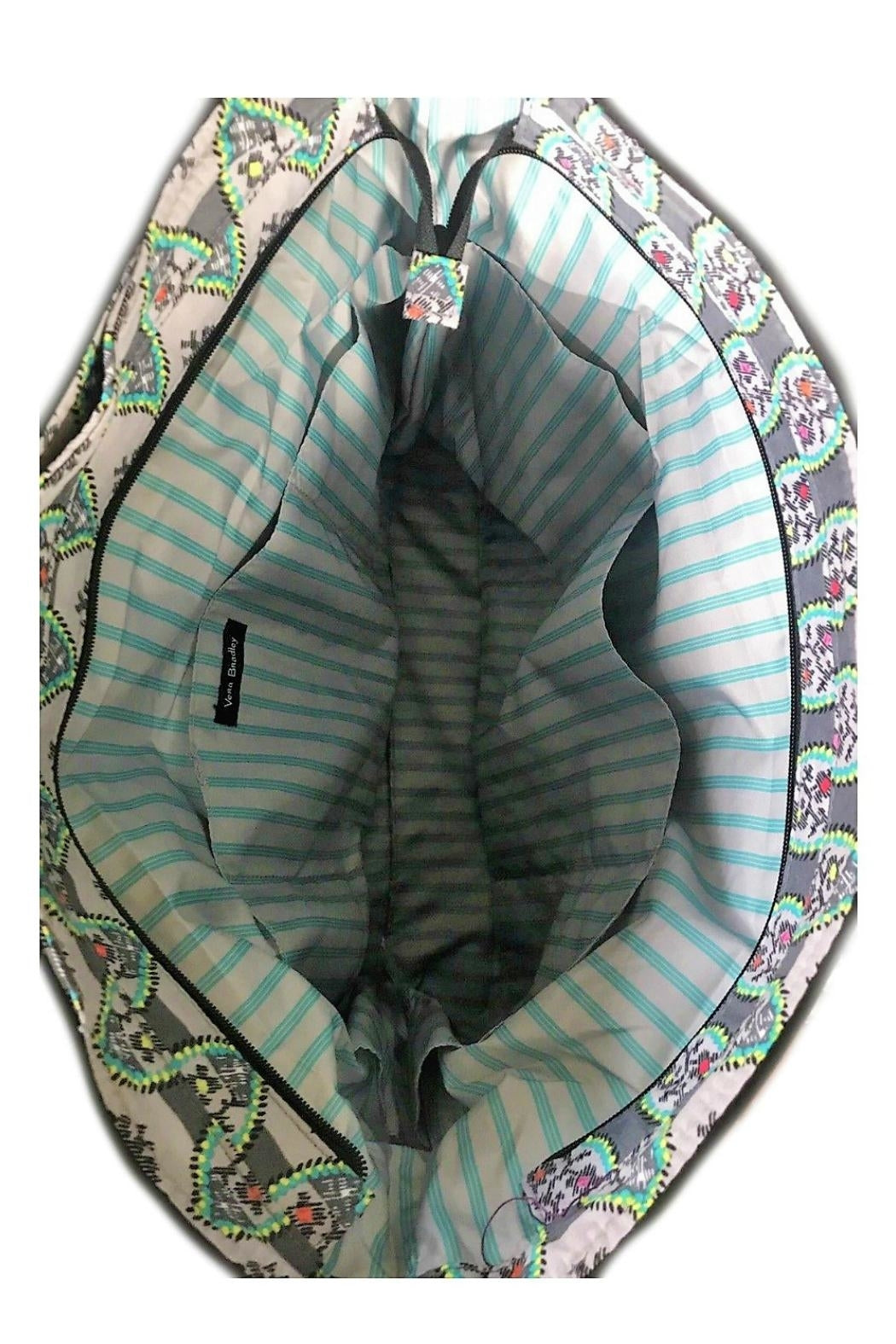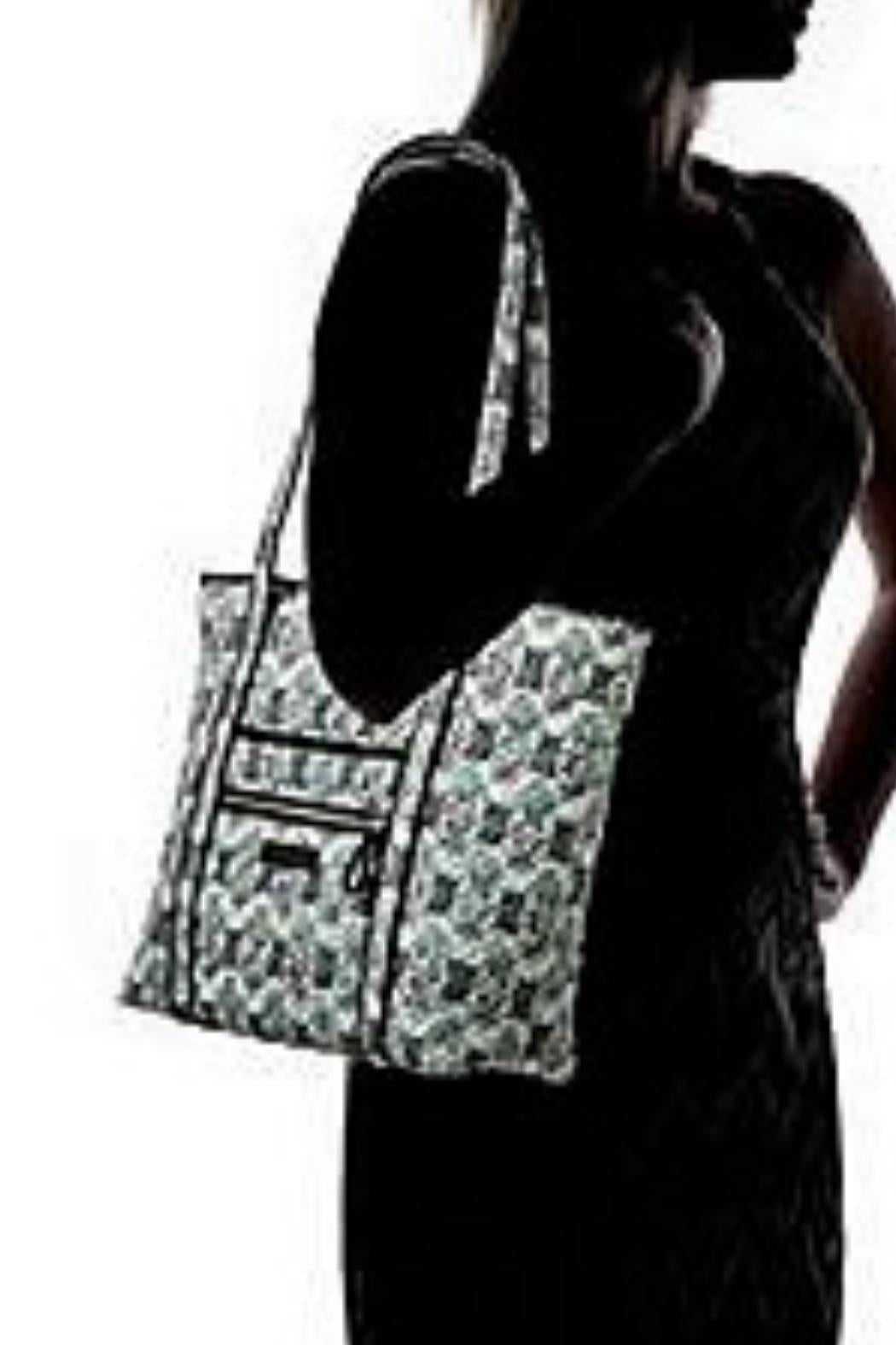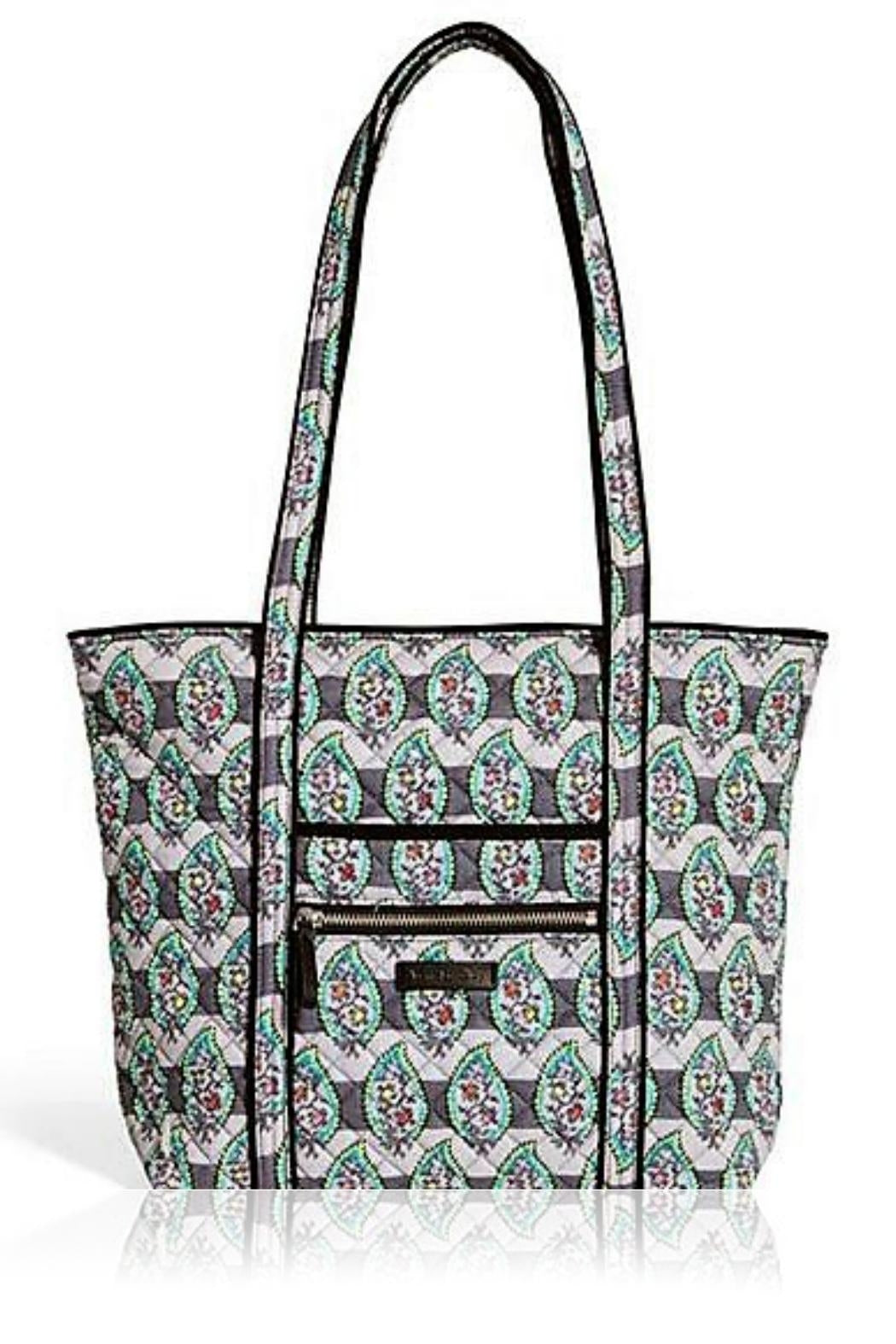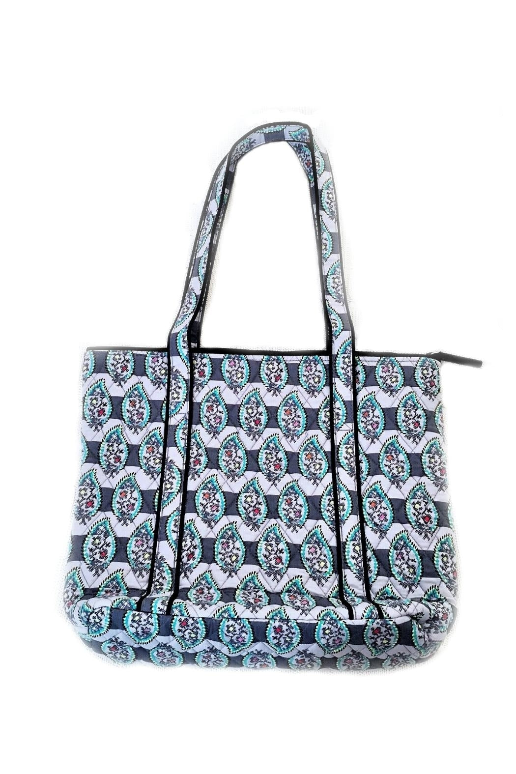 Here is the Vera Bradley Iconic Small Vera in the Paisley Stripes pattern. The quilted cotton is very lightweight, and folds flat for storage or packing. Exterior features a front slip pocket and a front zip pocket containing a charger pocket. The top edge of the bag features a "hidden" top pocket perfect for your phone or keys. Interior features six slip pockets that reach all the way around the inside of the bag. Beautiful coordinating striped poly satin lining. Zip closure and silver tone hardware. Works with Portable Battery Pack. Click on "Mimi's Gift Gallery" on this page to find other bags and accessories in the Paisley Stripes pattern. Dimensions 11 ½" wide x 11 ¼" high x 5" deep with a 12" double strap drop.