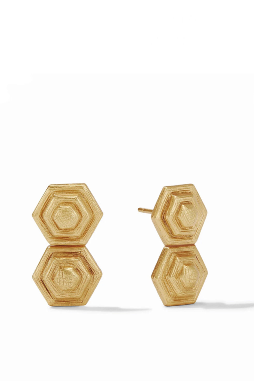 Double hexagonal earring with an elegant scored finish and raised geometric detail.