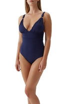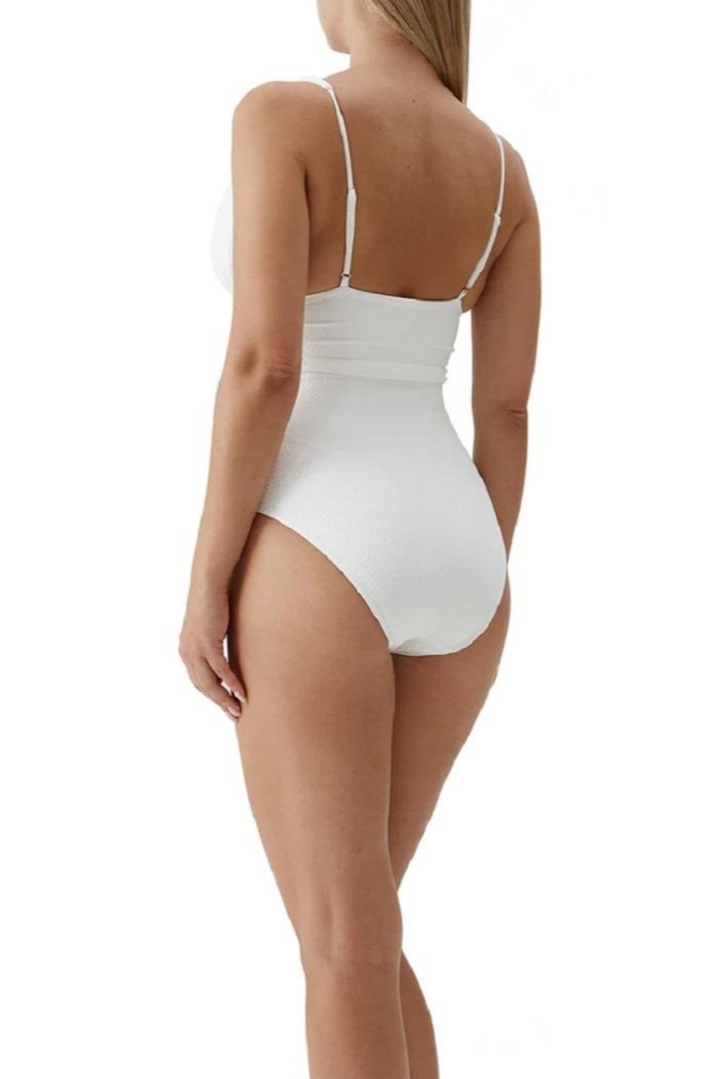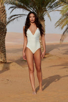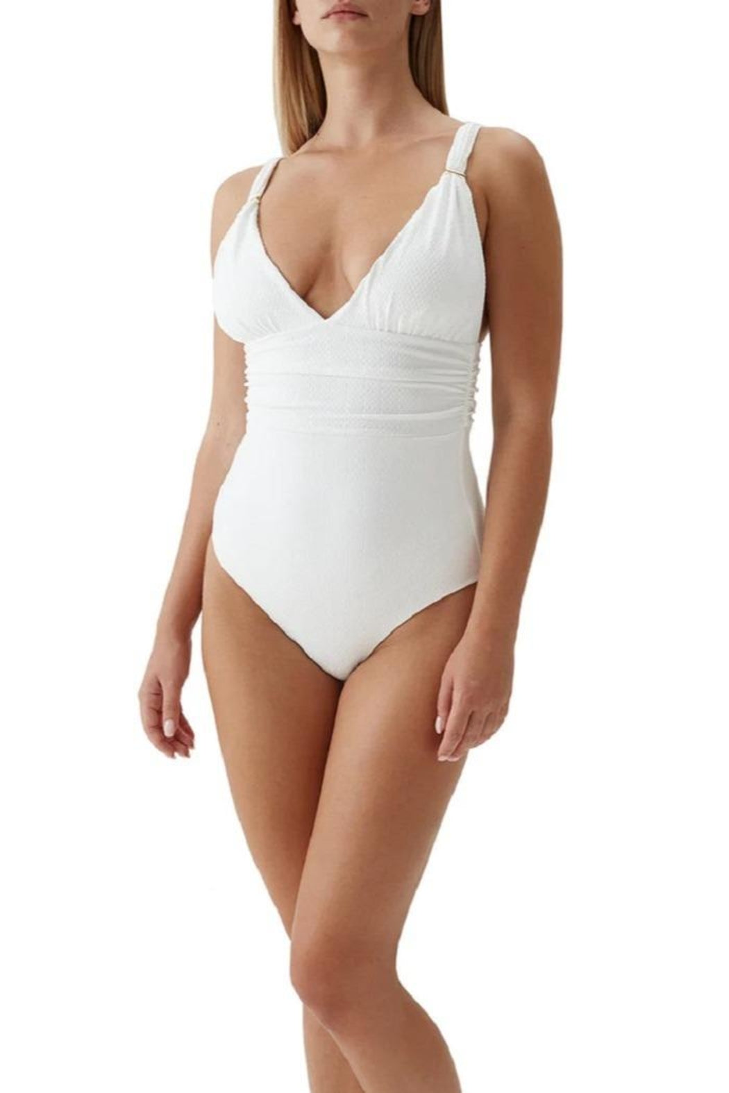 Showcase sun-kissed skin with the Panarea Swimsuit in crisp white. Crafted from premium Italian swimwear fabric, it boasts a luxe textured finish with added SPF 50+ protection. Understated, yet glamorous, this silhouette enhancing shape boasts a āVā neckline with ruching at the bust. Designed to support larger busts, it features removable pads and adjustable straps. A ruched panel defines the waist, while signature gold slider trims add a decorative, shimmering finish.