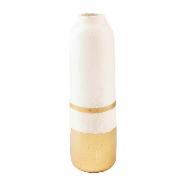 Our Large Gold Bud Vase is perfect for your favorite beautiful blossoms. The papier-mâche vase features hand-painted details. This vase is a perfectly seasonless piece that can showcase florals for every season. We recommend adding your favorite dried florals or pampas grass to this vase.