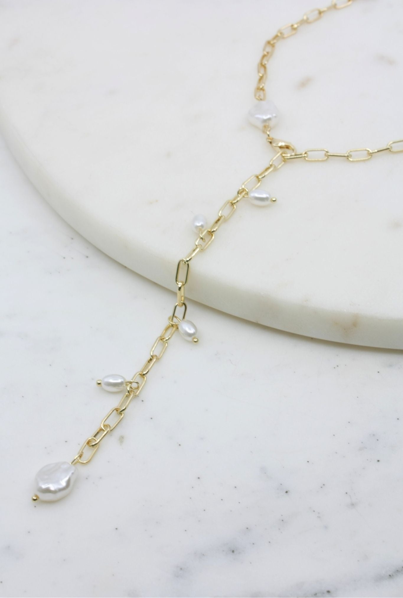 A paperclip chain necklace with pearl accents on tassel. Available in gold.