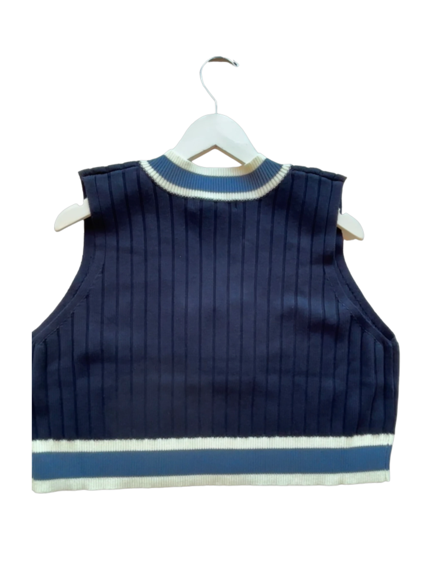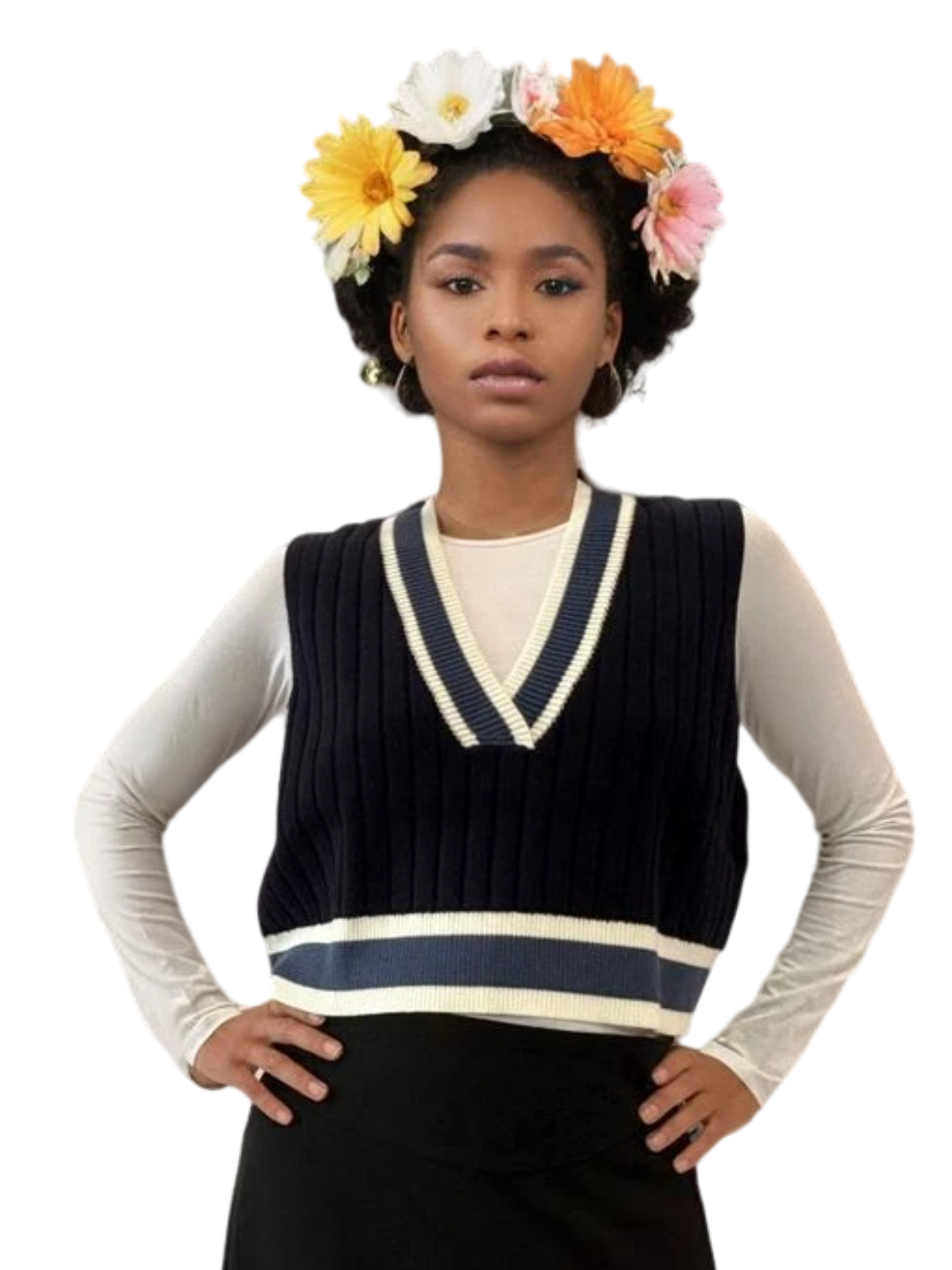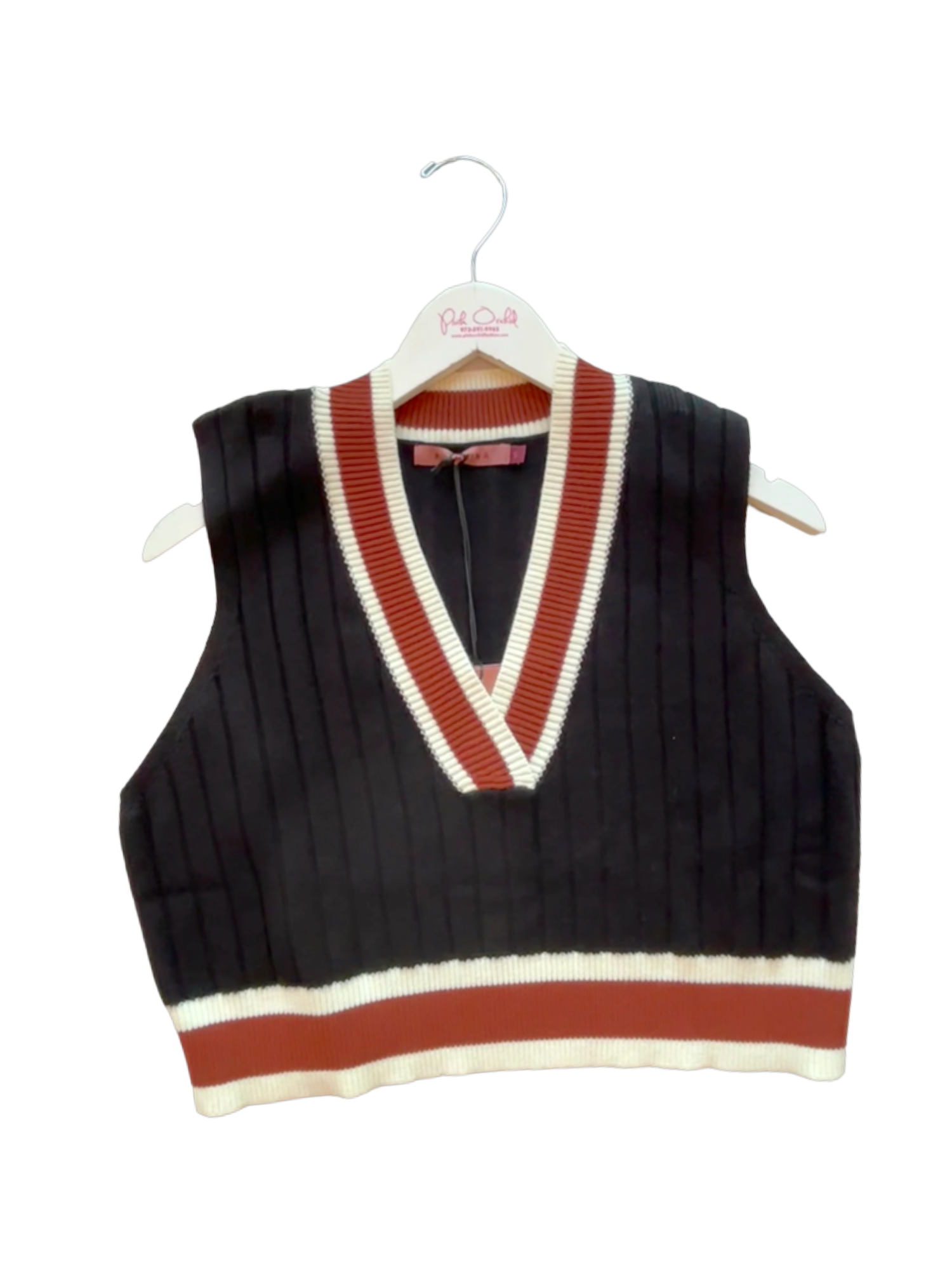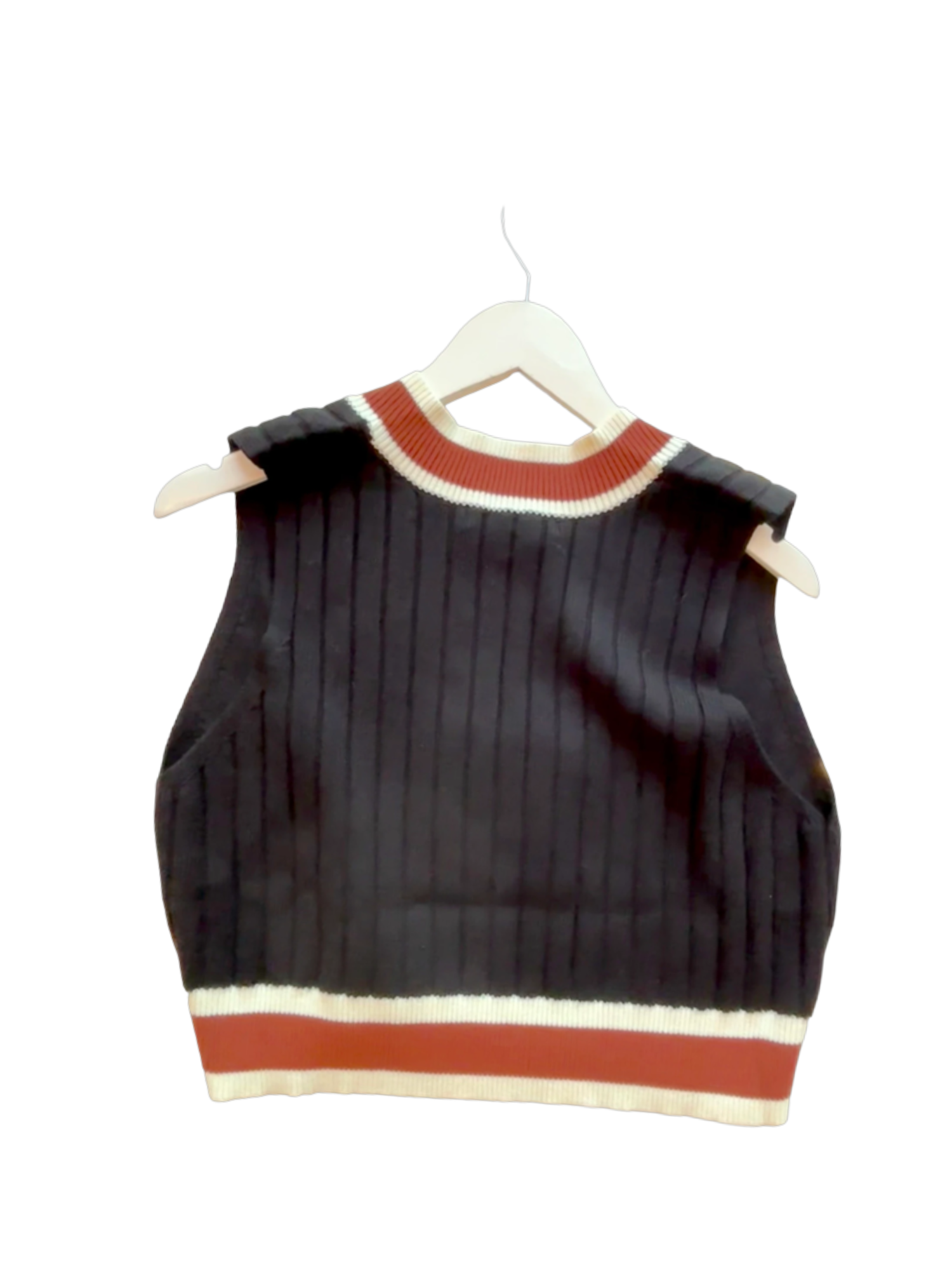 Look - Elevate your casual style with the Pashmina Varsity Knit Vest. Crafted from soft, breathable fabric, this versatile vest adds a chic layer to any outfit. The classic varsity design and ribbed trims offer a timeless appeal, perfect for transitional weather. Whether paired with jeans or a skirt, it's a wardrobe essential that combines comfort and effortless style.