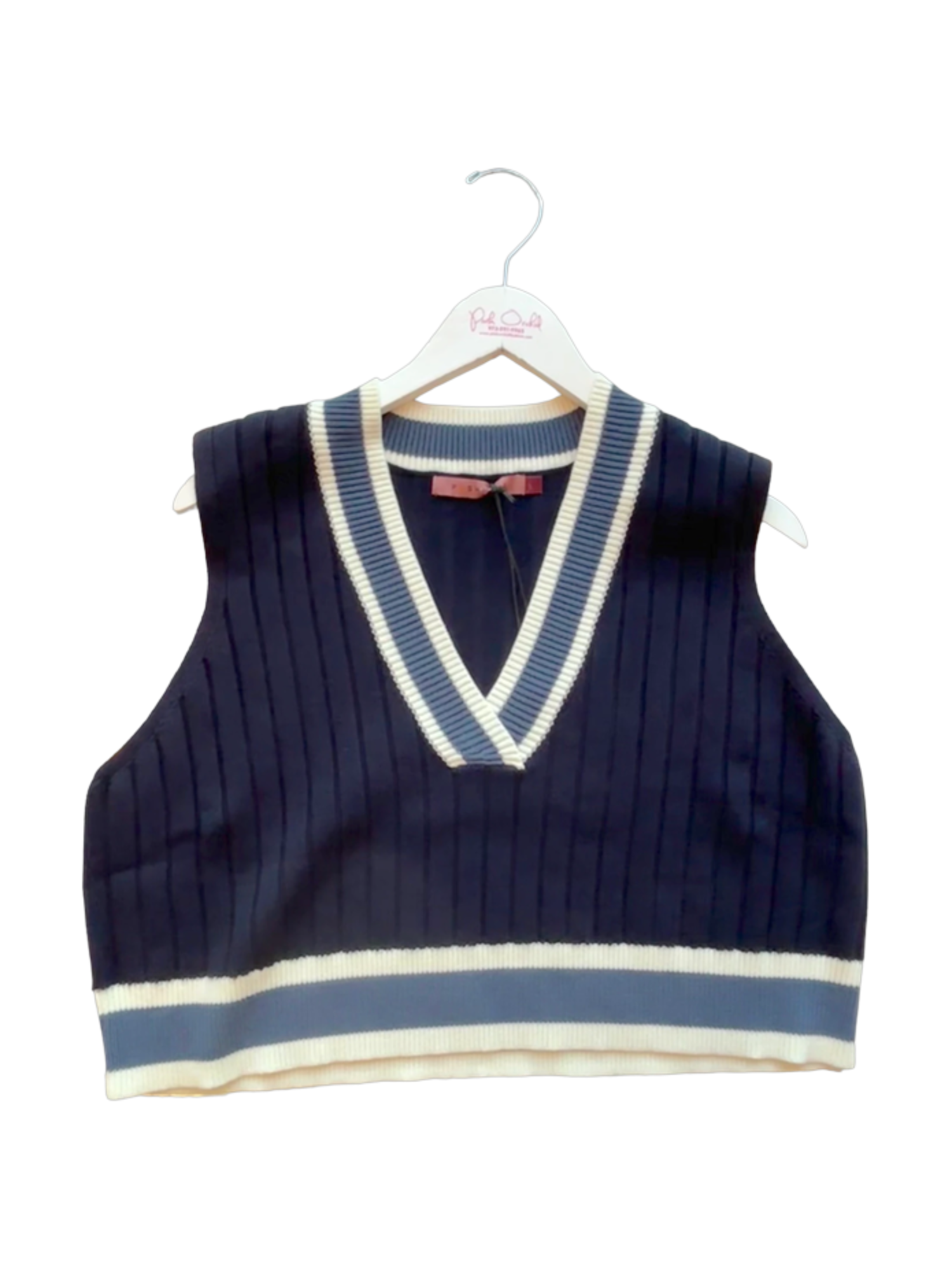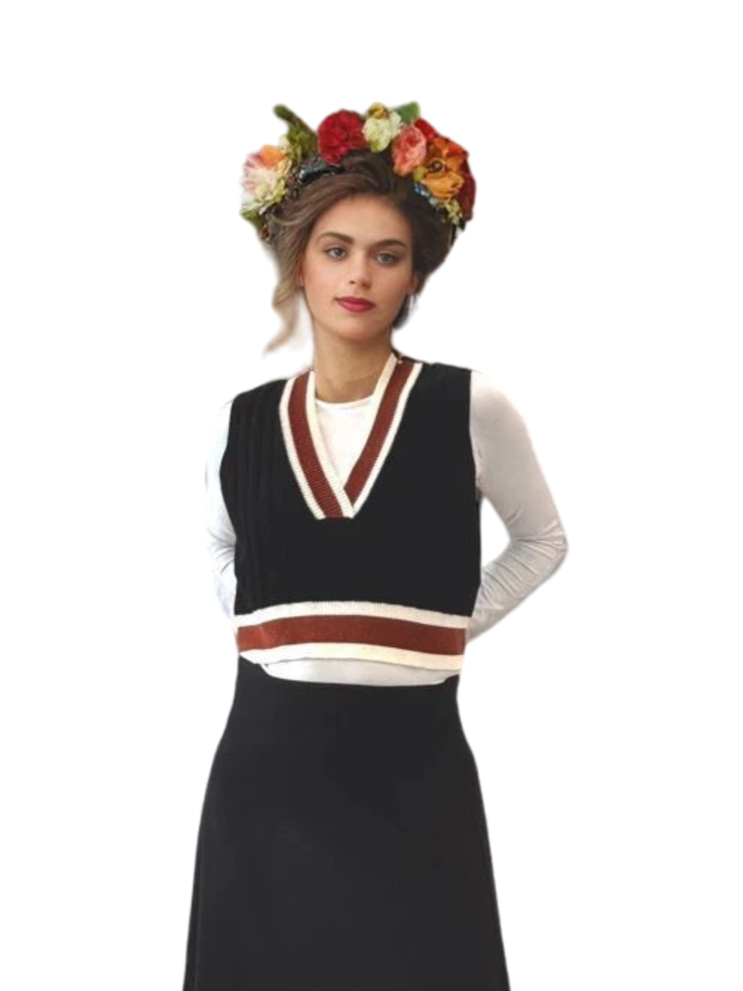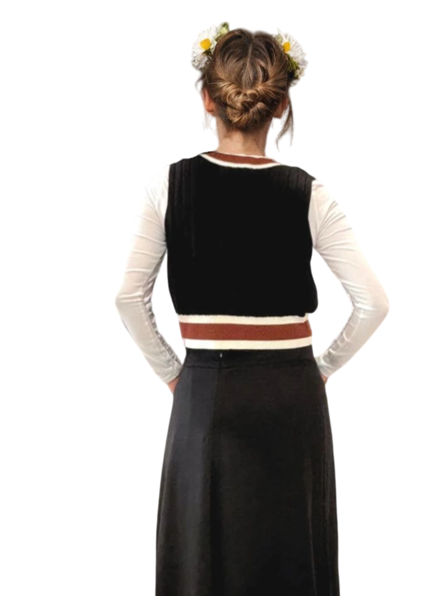 Look - Elevate your casual style with the Pashmina Varsity Knit Vest. Crafted from soft, breathable fabric, this versatile vest adds a chic layer to any outfit. The classic varsity design and ribbed trims offer a timeless appeal, perfect for transitional weather. Whether paired with jeans or a skirt, it's a wardrobe essential that combines comfort and effortless style.