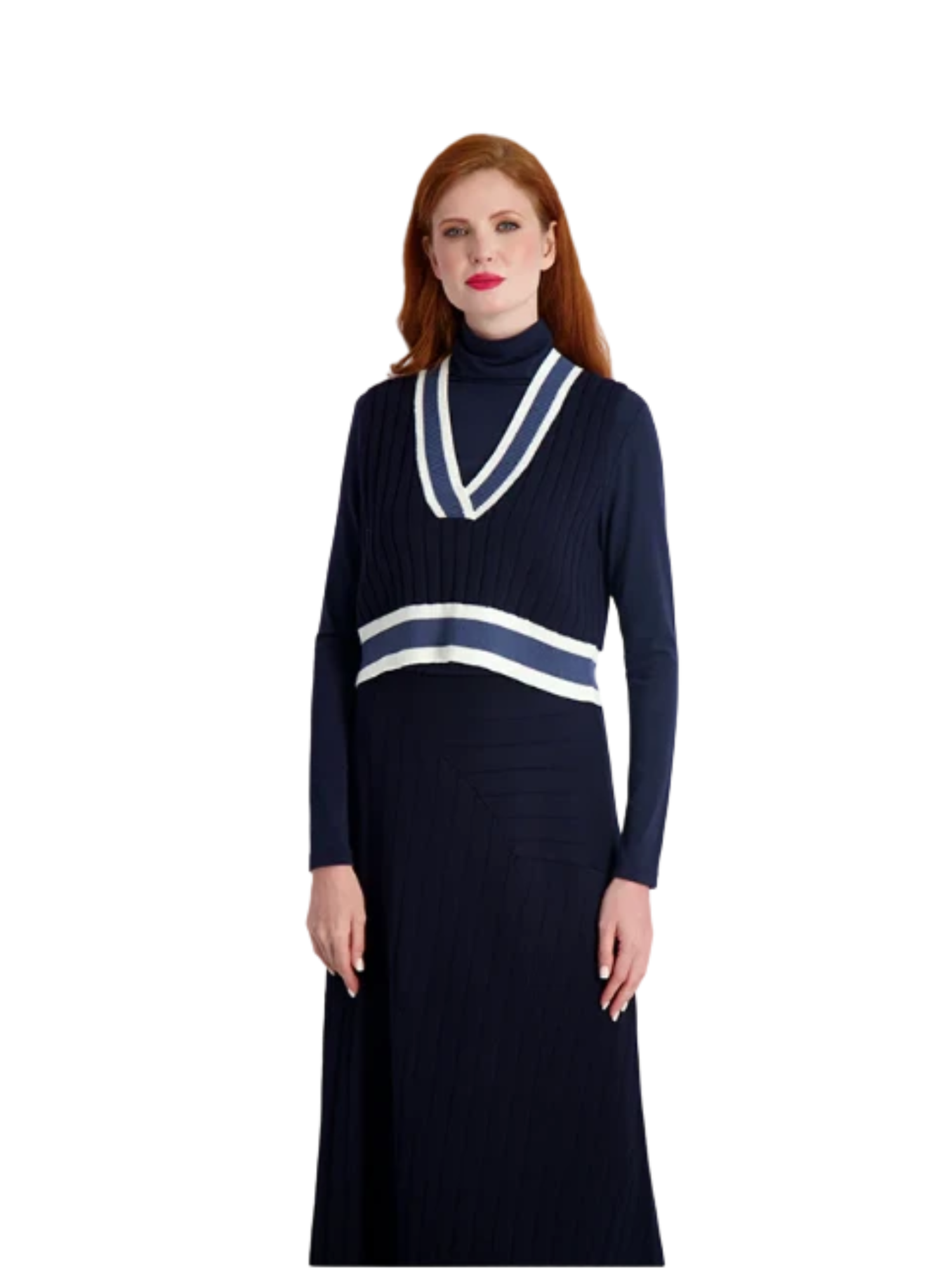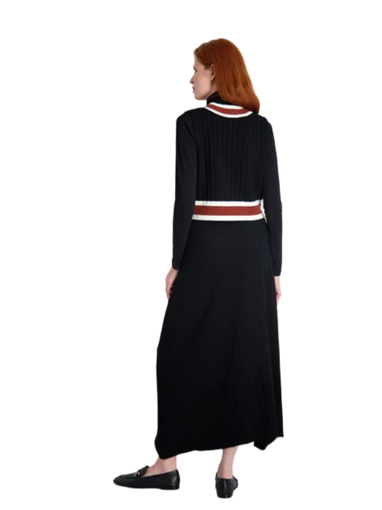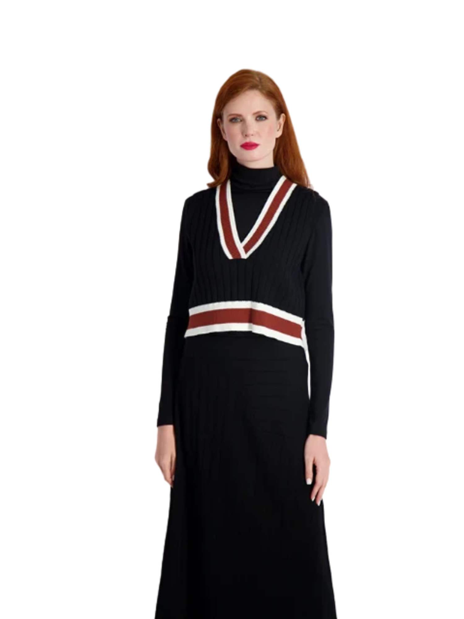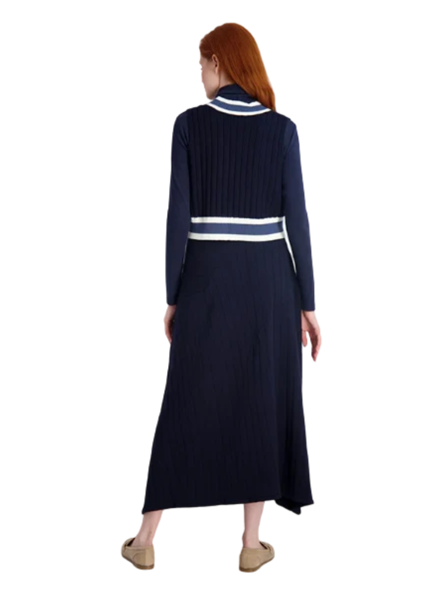 Look - Elevate your casual style with the Pashmina Varsity Knit Vest. Crafted from soft, breathable fabric, this versatile vest adds a chic layer to any outfit. The classic varsity design and ribbed trims offer a timeless appeal, perfect for transitional weather. Whether paired with jeans or a skirt, it's a wardrobe essential that combines comfort and effortless style.