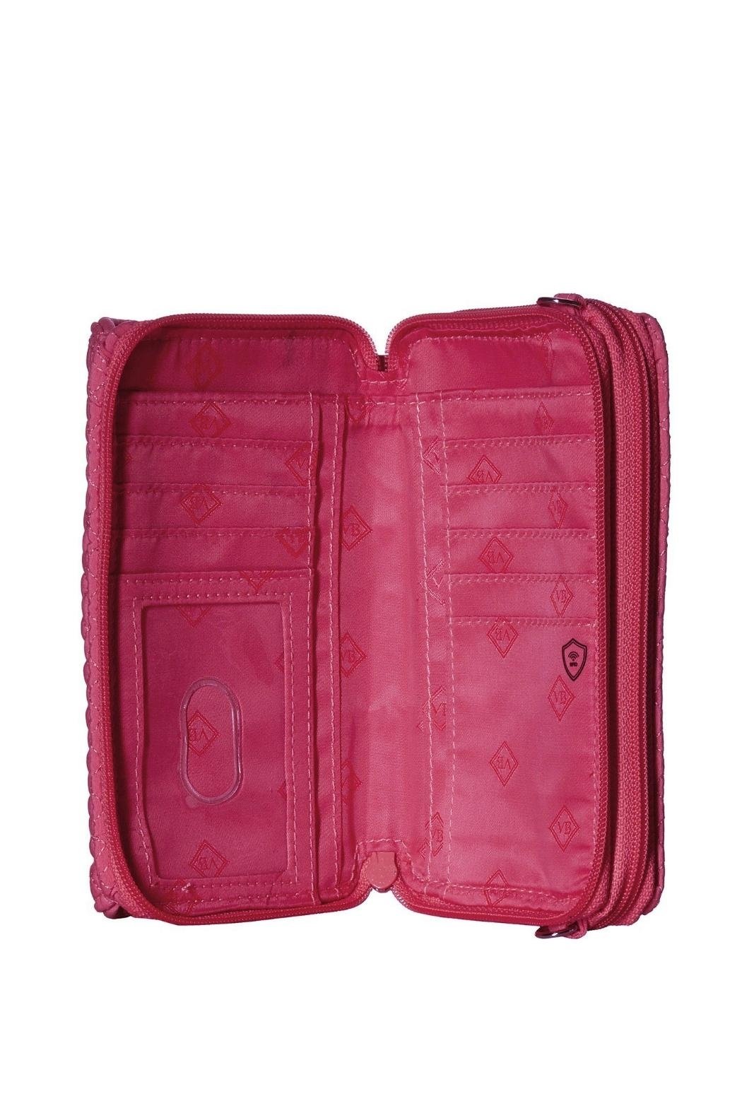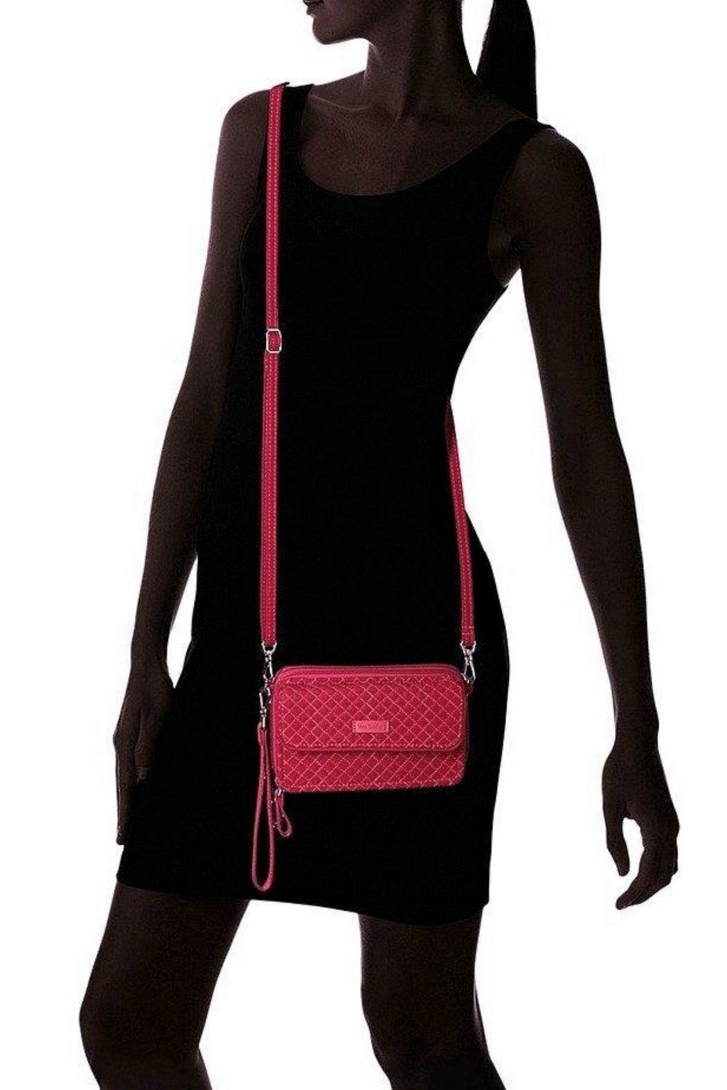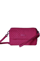 Meet the Vera Bradley Iconic RFID All In One Crossbody in the color Passion Pink. Protect your information with this RFID technology so you can have fun and stay fabulous. This little bag is designed for hands free movement and the adjustable strap allows you to wear this bag cross body, or simply hung from one shoulder, and it comes with a wrist strap allowing you to wear it from your wrist as well. Magnetic snap closure on the front exterior compartment which holds a phone up to 6.5". One zippered compartment has a built-in wallet which includes a large bill pocket, 7 credit card slips, 4 more slip pockets, and an ID window. The back zippered compartment has 2 bill pockets, two pleated pockets, 4 more card slips, and a zippered coin pocket. The bag is made of mini quilted microfiber, making it water and soil resistant. The lining is fashioned from matching poly satin fabric. Find matching Passion Pink bags and accessories on the "Mimi's Gift Gallery" boutique page. Dimensions are 6.75" x 4.5" x 2.5" with a 52 inch removable/adjustable strap and 7 inch wrist strap.