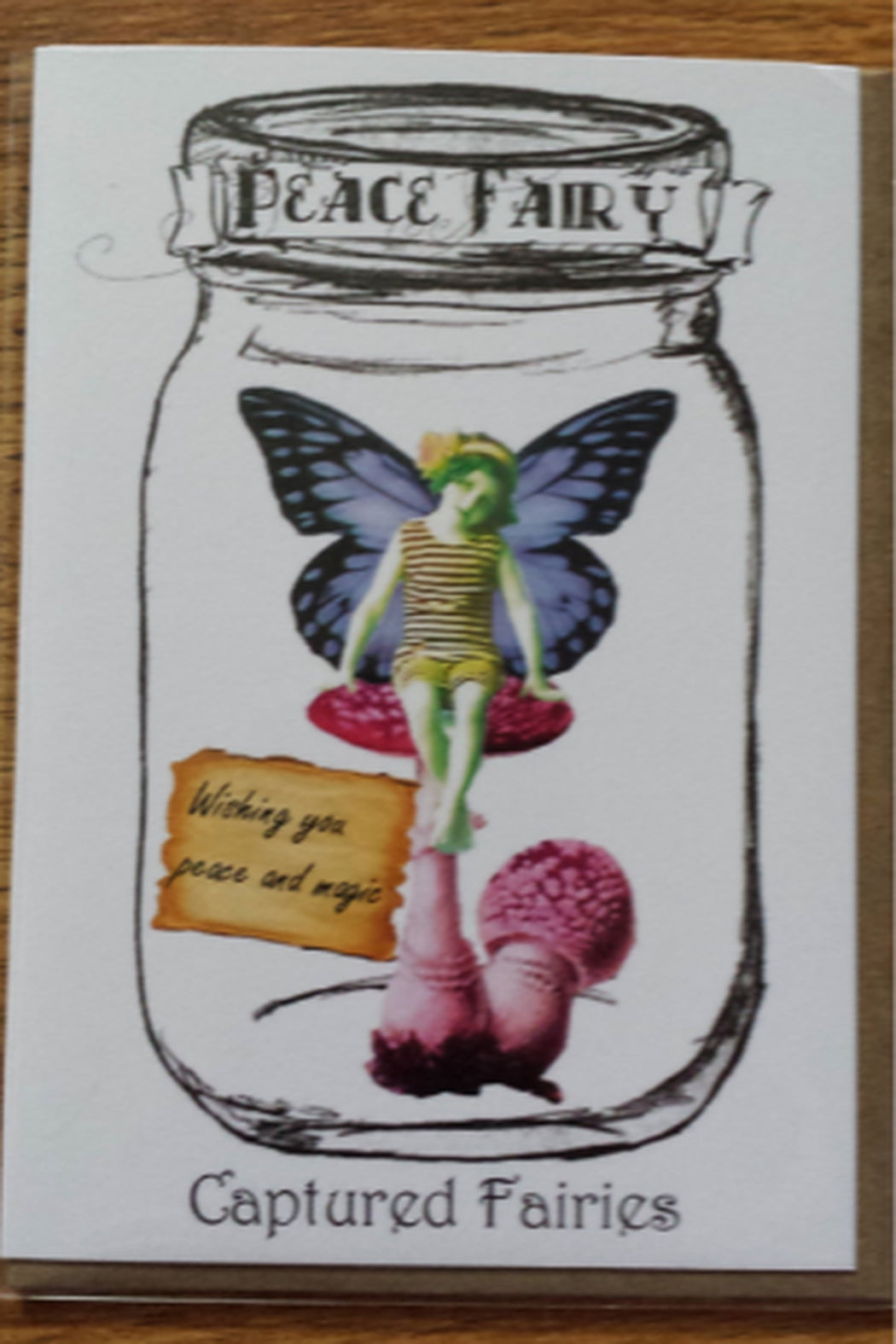 This is part of our captured Fairy line each card is a 3 1/2 x 5 with a kraft paper envelope. They are all blank inside to write your own message. On the back tells about Captured Fairies and also reads "May this Fairy bring you happiness and joy"