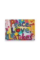 A colorful tempered glass cutting board decorated with bold hand-lettered art reading “Peace, Love, Latkes.” The Peace, Love, & Latkes Glass Cutting Board is sturdy enough for everyday chopping and attractive enough for serving appetizers or holiday spreads. Designed by Kristin Smith, the vibrant graphic adds playful, festive flair to any countertop or table.