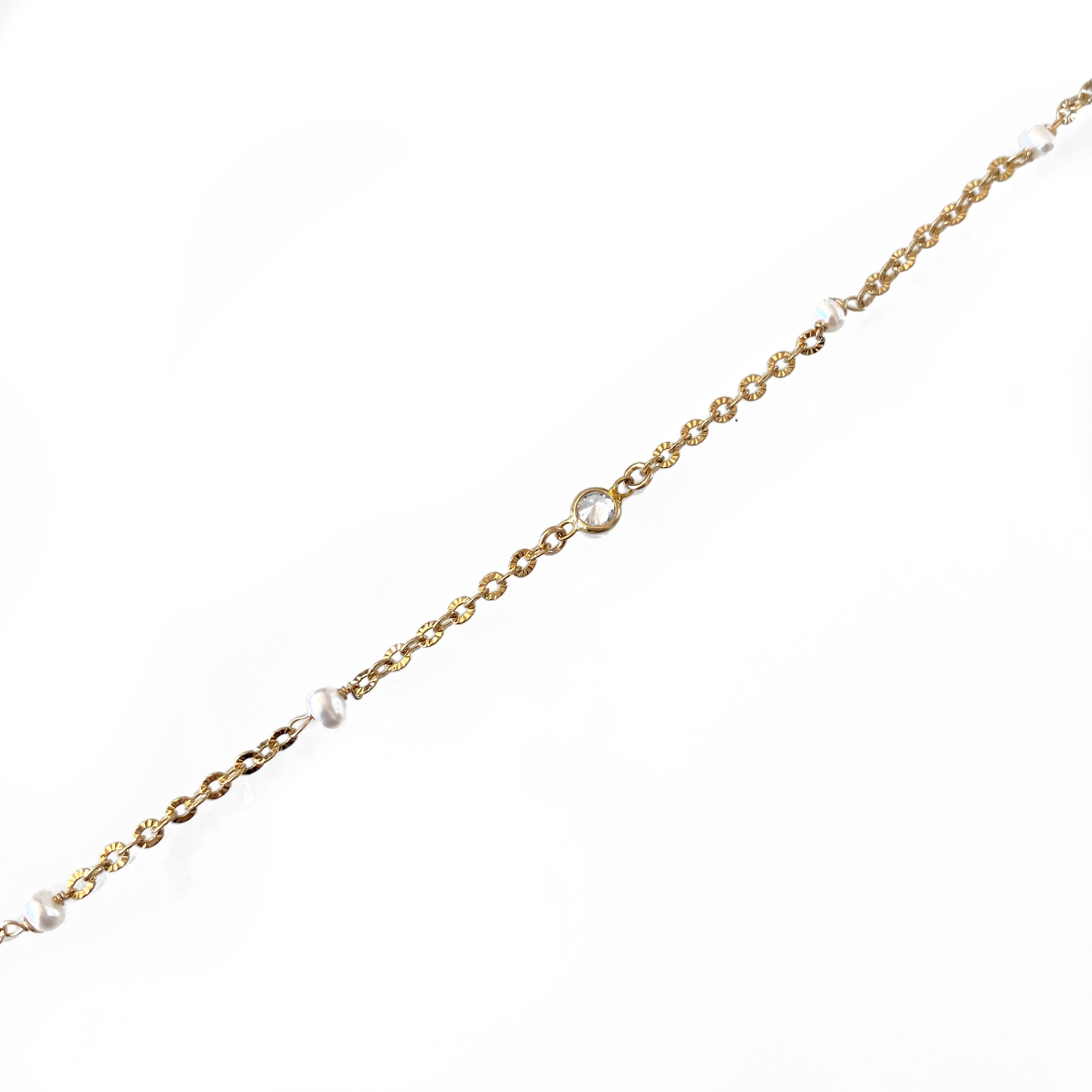 The Pearl CZ Anklet combines playful charm with elegant style. Made with gold-filled material, freshwater pearls, and dazzling CZ stones.