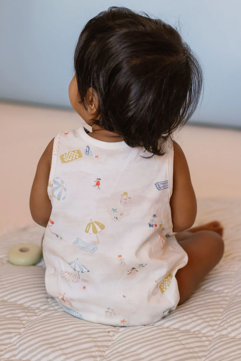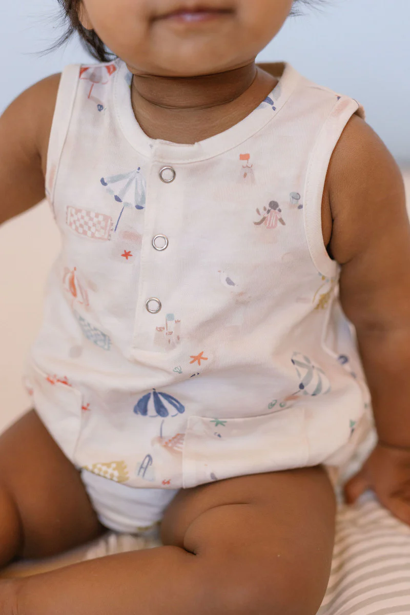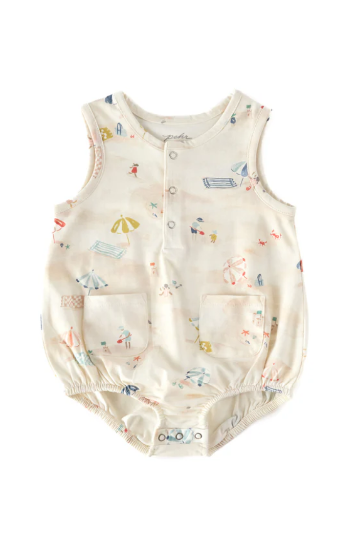 Whether for a backyard picnic or trip to the beach, our Sleeveless One-Piece offers a relaxed, billowy fit to keep baby comfortable. Made from organic cotton with the cutest two pockets, the front placket and bottom snap closures make for easy on and off the whole day through. Certified Organic Cotton & Dyes Ethically Made TAKE CARE OF YOUR PEHR Machine wash cold, tumble dry low, do not bleach, warm iron if needed. Do not iron on back printed label.