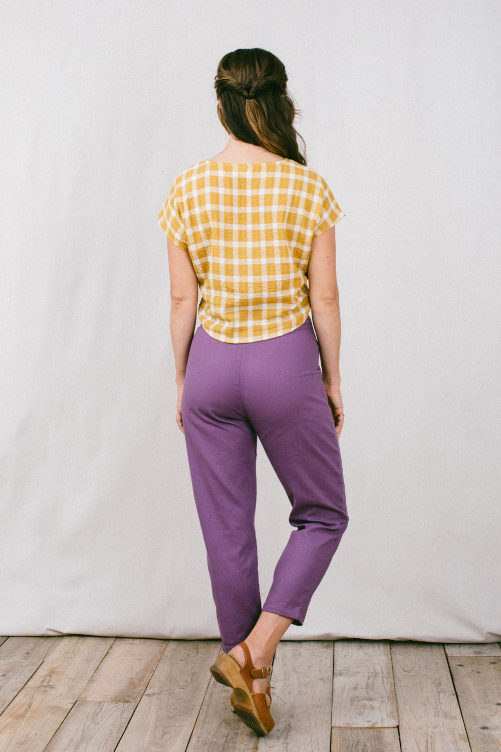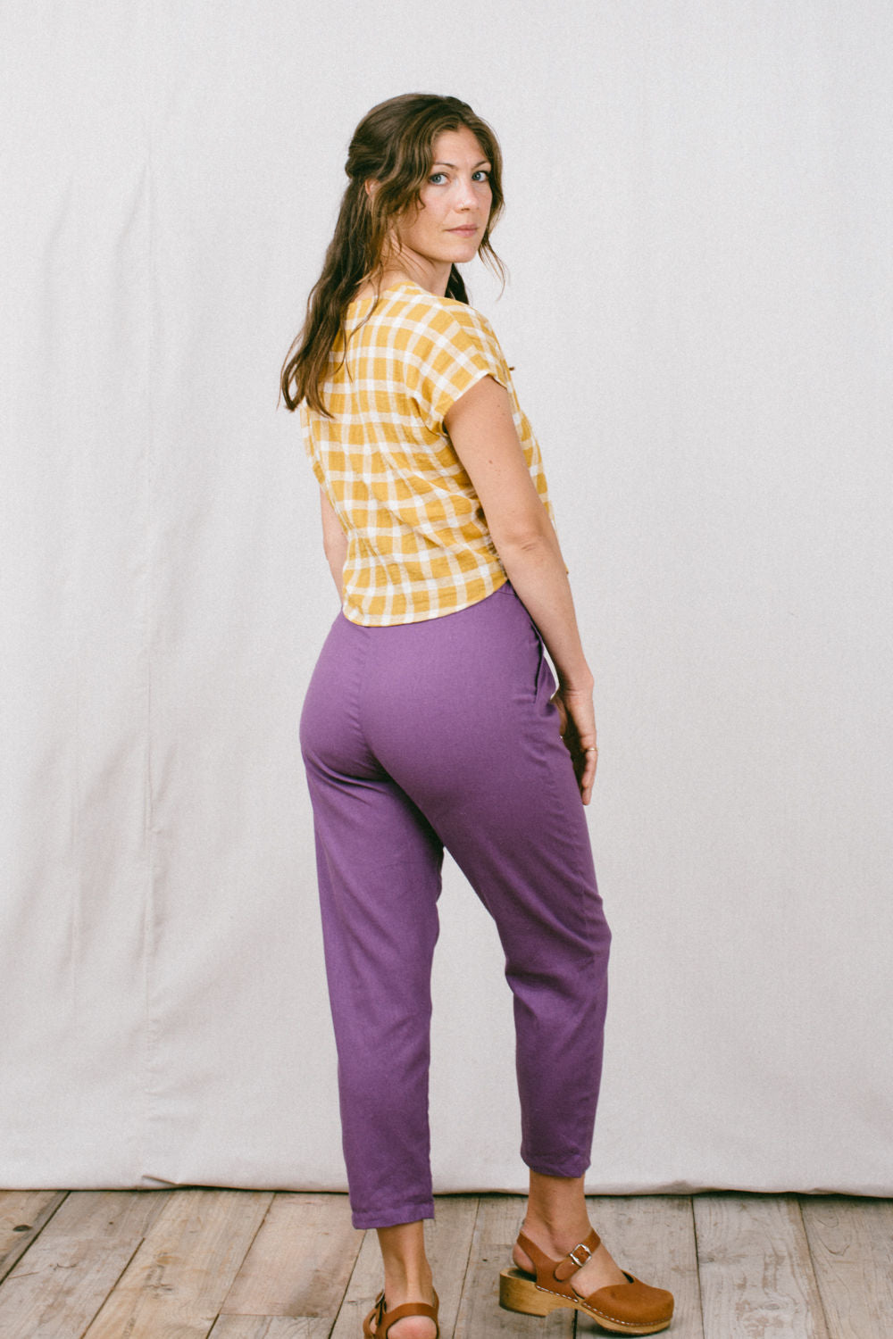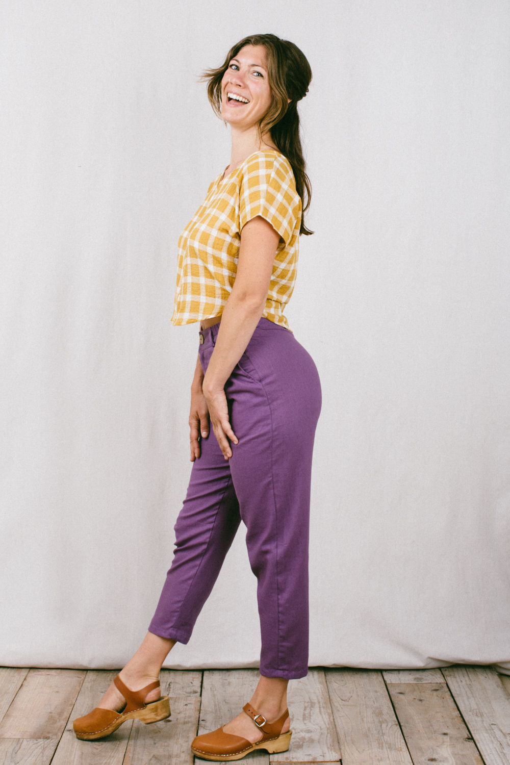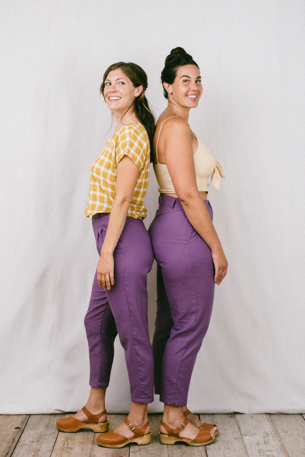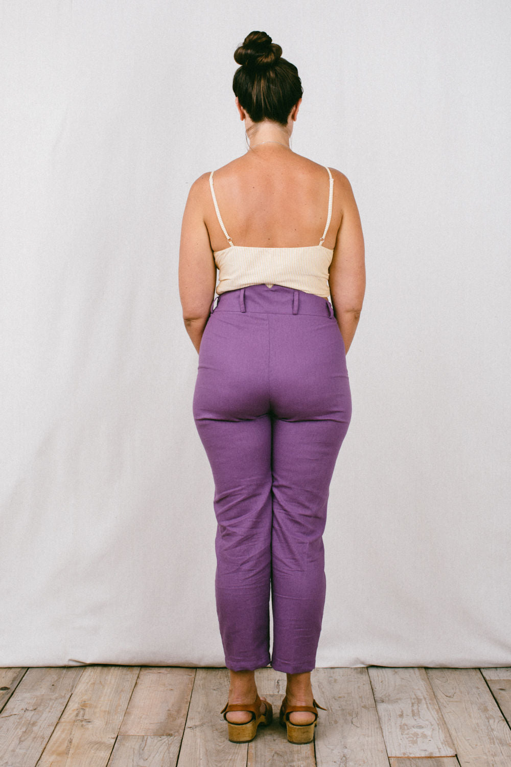 High waisted pants for femmes that don't like to wear pants. Our most flattering and versatile pant yet. Magically makes everyone's booty look amazing with no darts! Bamboo button fly with quality USA made nylon zipper. A little elastic sewn in the waist band for some ease as we know you like to move & breathe. Over sized belt loops. Super high rise, to fit at the smallest part of your waist. Raised tail fin detail on back waist band with double fuzing that hugs and shapes the small of your back beautifully.