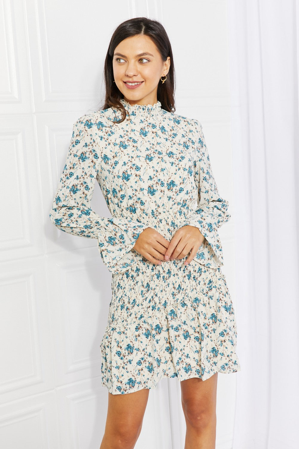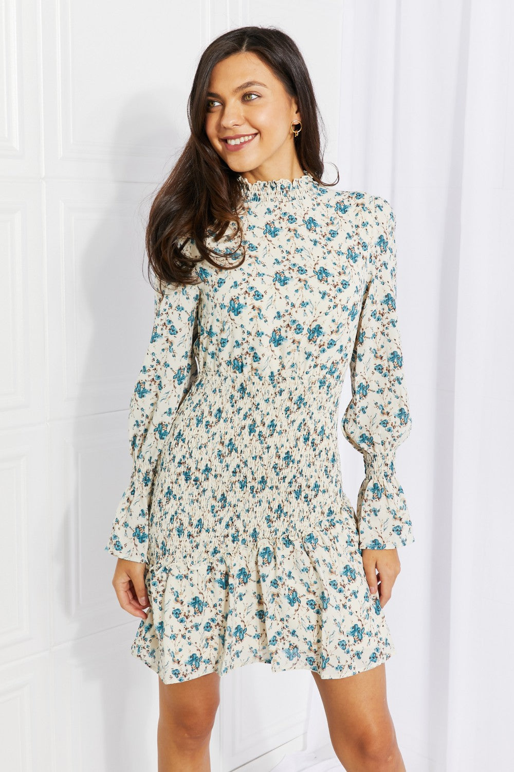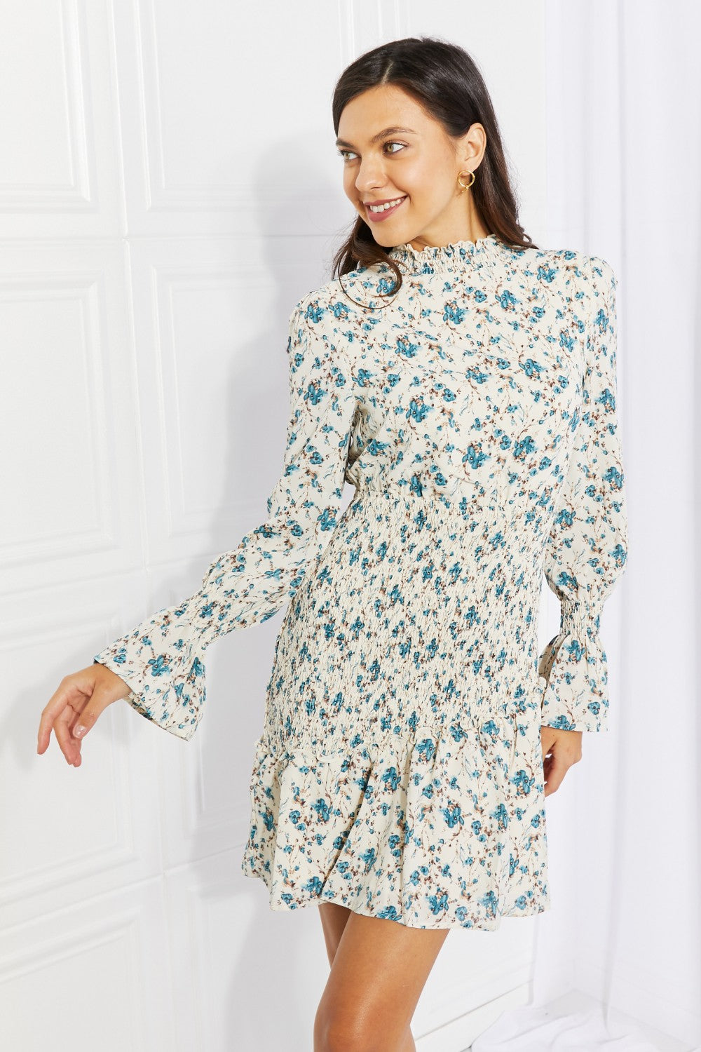Petal Dew Meadowscape Floral Smocked Mock Neck Mini Dress