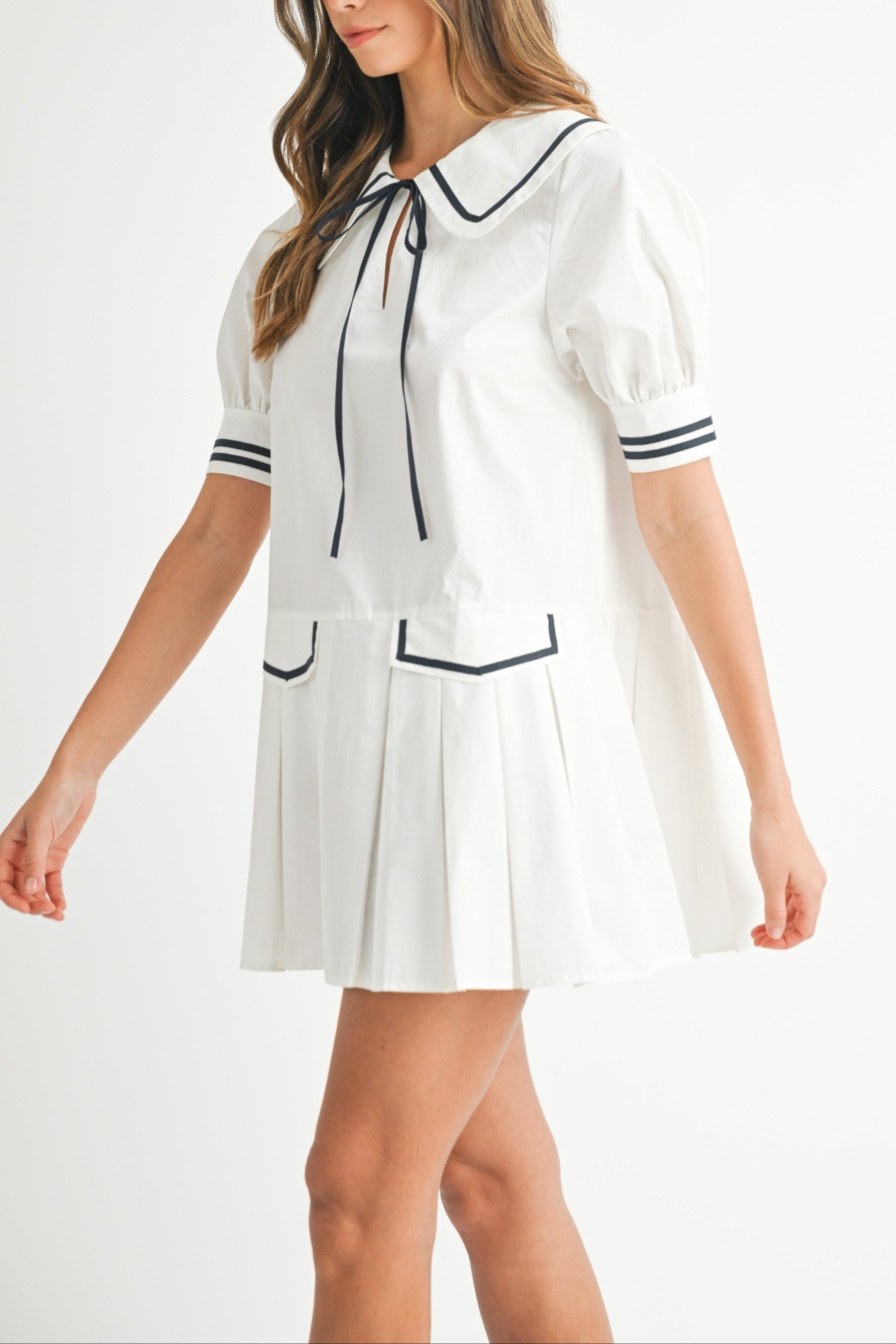 With its comfortable fit and versatile design, it pairs effortlessly with a variety of accessories to create the perfect look. The pleated skirt adds a touch of movement and sophistication, while the collar enhances the dressβs youthful appeal.