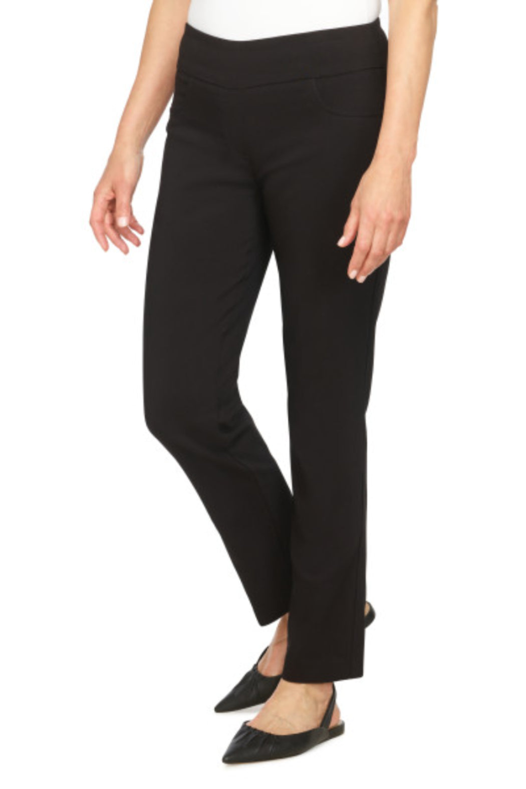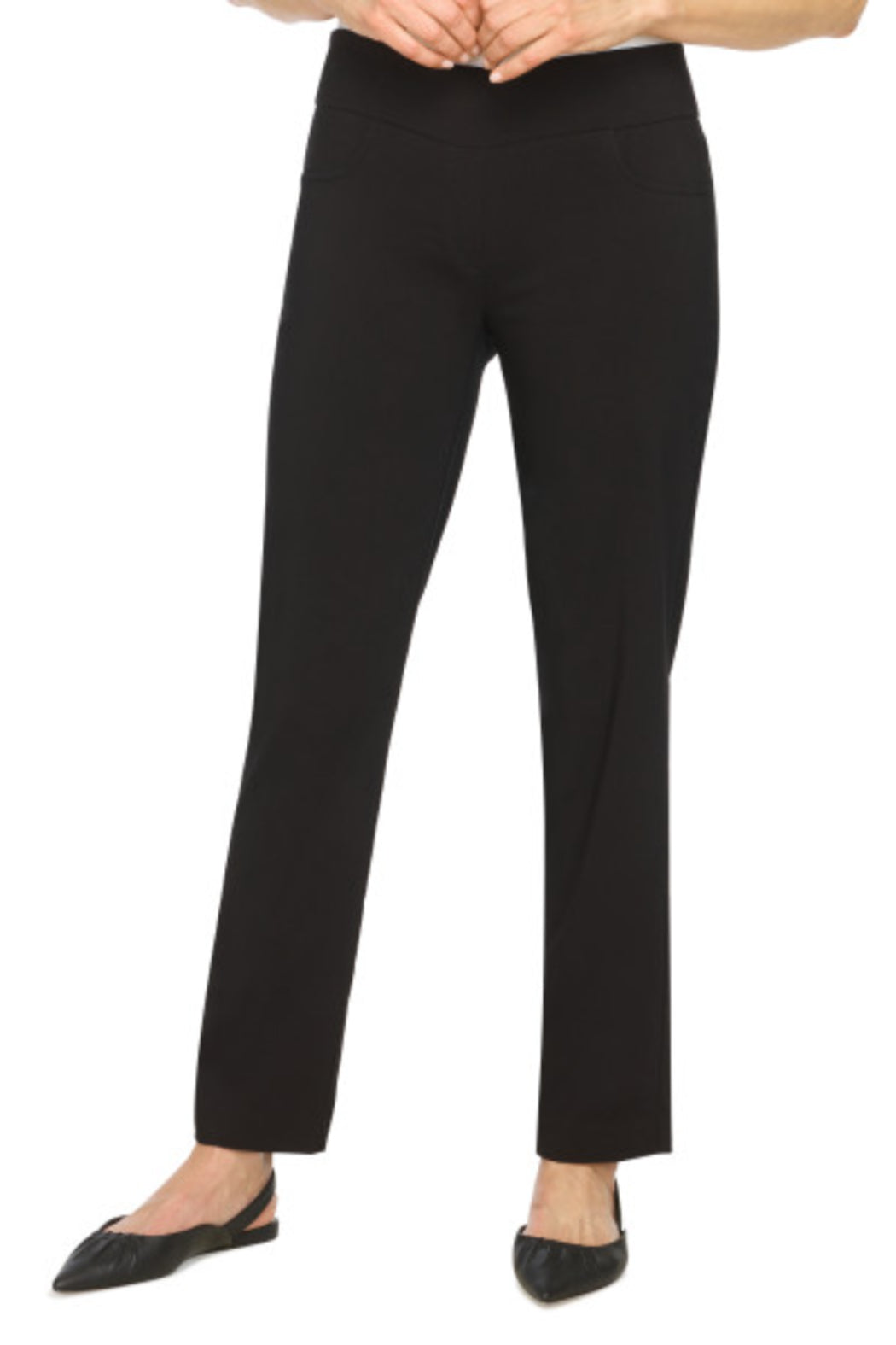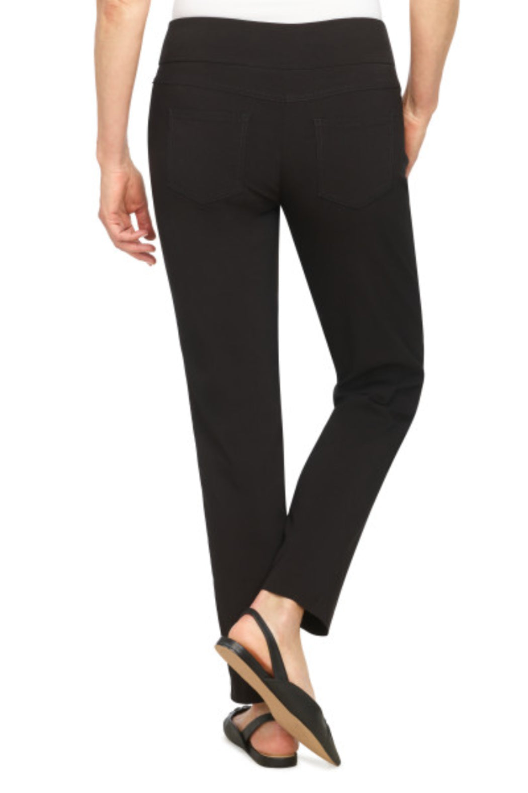 Perfect flat front silhouette pull on pant with wide mid-rise elastic waistband, two functional back pockets, front tummy panel, and side slits at hem.