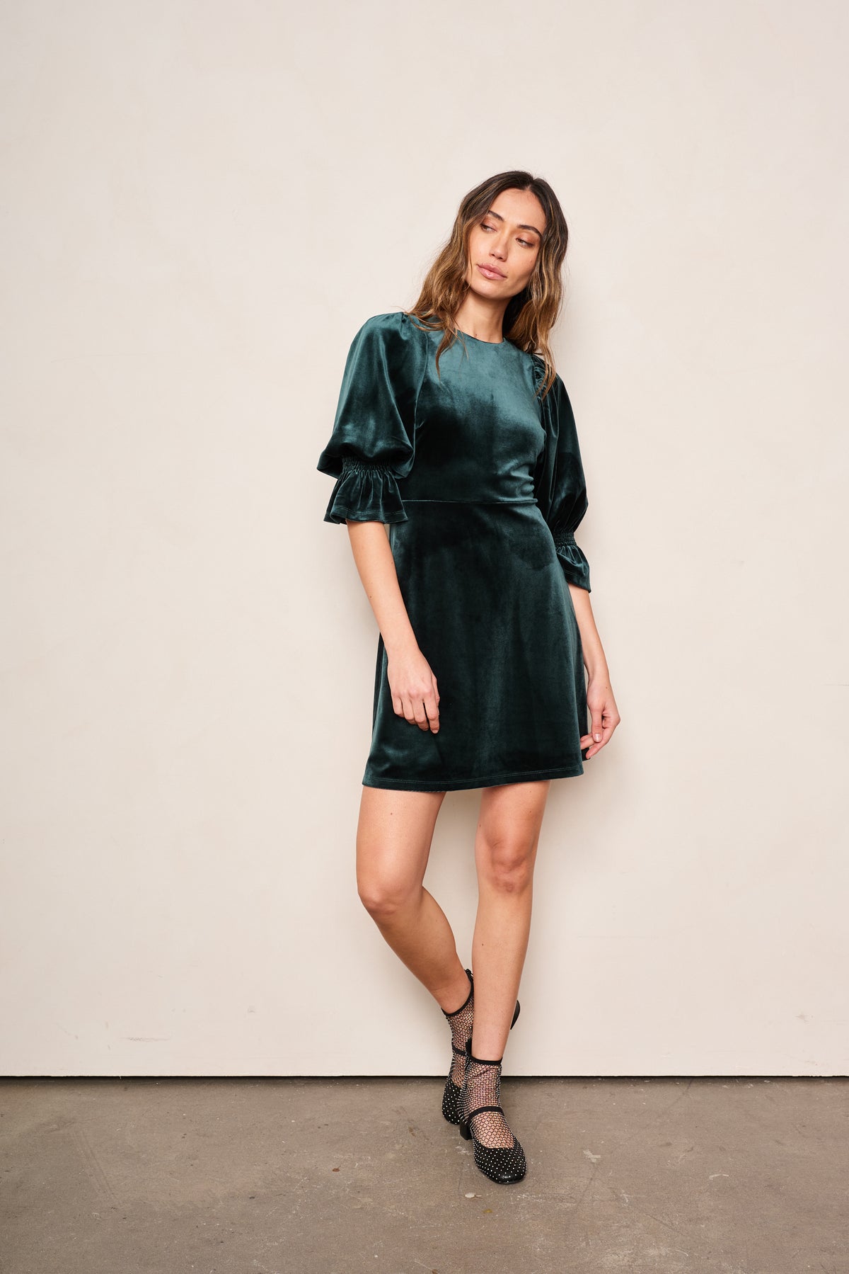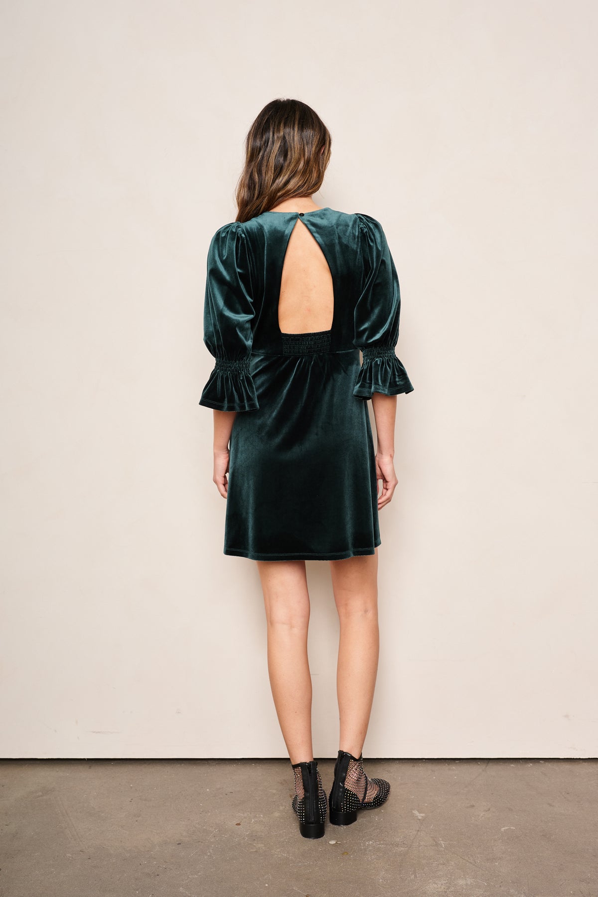 The Phoebe dress is a quintessential example of modern elegance. Featured in a striking Emerald velvet fabric, this silhouette is designed to captivate. Sitting gracefully just above the knee, its billowy 3/4 length sleeves add a touch of romance while a daring cutout at the back adds a lasting impression from every angle.