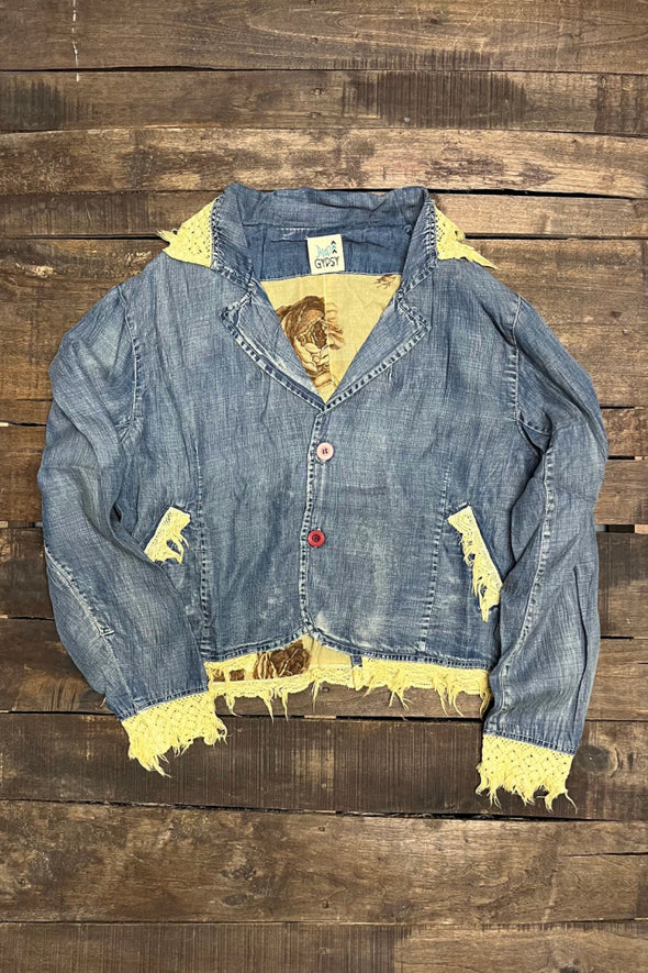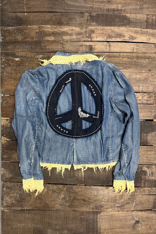 Spice up your wardrobe with the Phoebe Harmony Jacket by Jaded Gypsy - it's the perfect combo of sass and style! Featuring a standout back peace sign graphic, distressed lace hems on the cuffs, waist, collar and front pockets, and an eclectic mix of colorful buttons - it's the statement piece you need to stand out from the crowd!