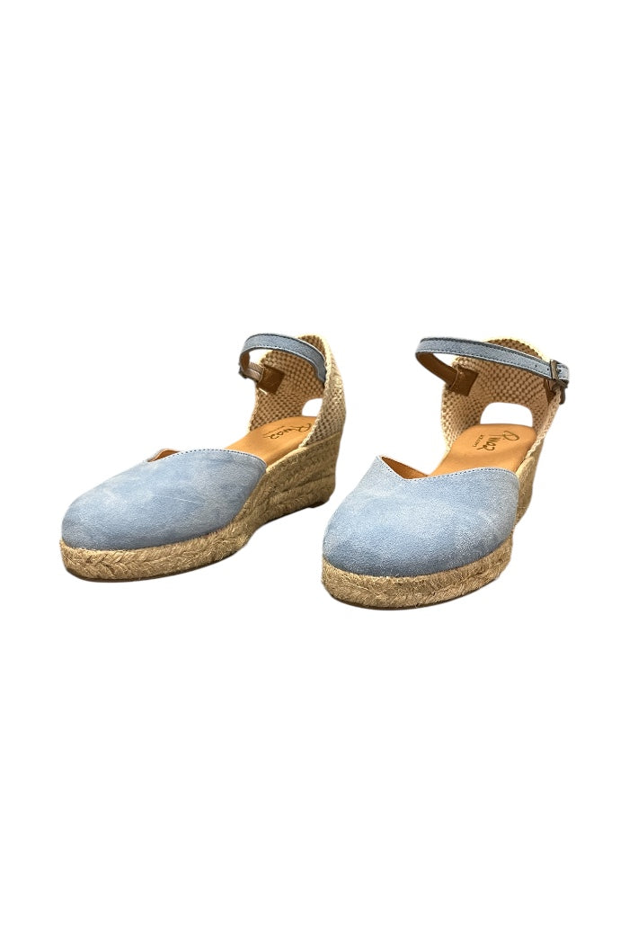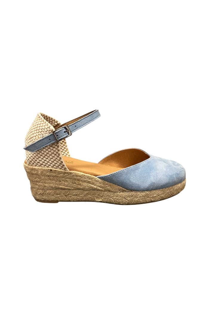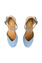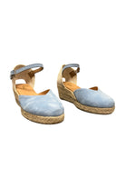 Charming and effortlessly feminine, these light blue espadrille wedges are a summer must-have. Featuring a soft closed-toe design, woven heel detail, and a delicate ankle strap with buckle closure, they offer both comfort and classic style. The natural jute-wrapped wedge adds a touch of rustic elegance—perfect for sunny days and weekend getaways.