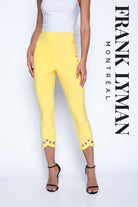 Stylish lightweight silky knit high waisted crop pant with silver grommet detail. Pull on style no zippers. Pair back with tunic top 201315. Easy care fabric, hand wash cold water, 95% polyester-5% elasthane. Un lined with an approx. 11 inch rise and 23 inch inseam