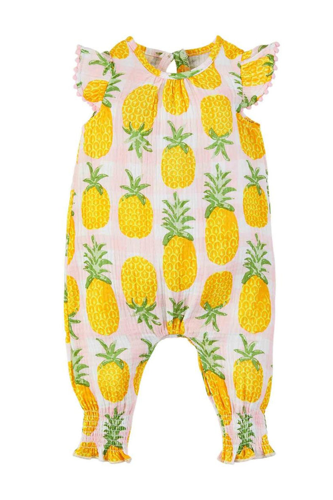 Cotton gauze longall features flutter sleeves with pom trim and smocked leg openings with ruffles. Inner leg ring snap closure.