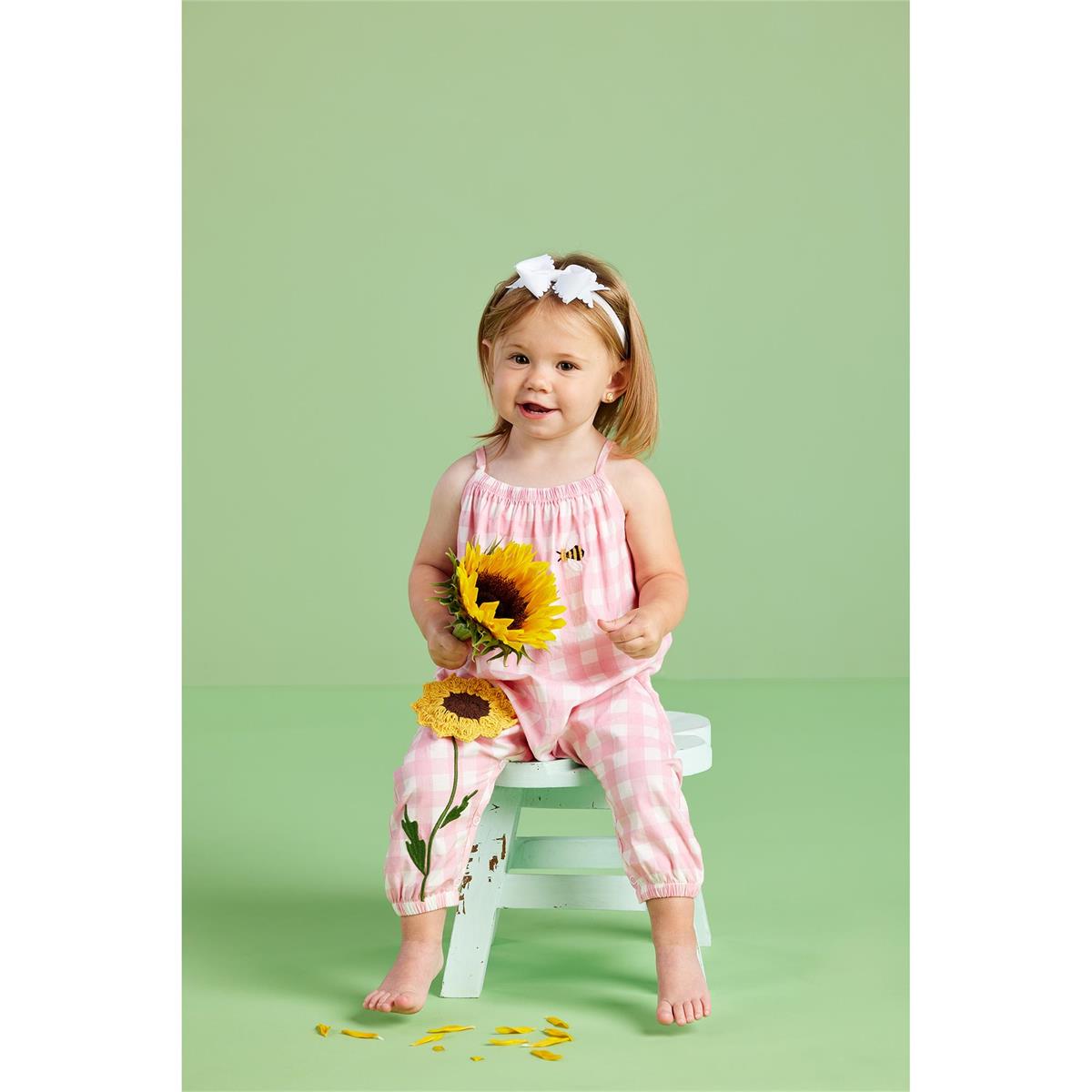 Happiness is home grown with our Sunflower Check Longall. The gingham sleeveless longall features crochet applique. The longall also features embroidered details. The longall has an inner leg snap closure. The longall features a blue and white gingham pattern with a flower and bee detail.