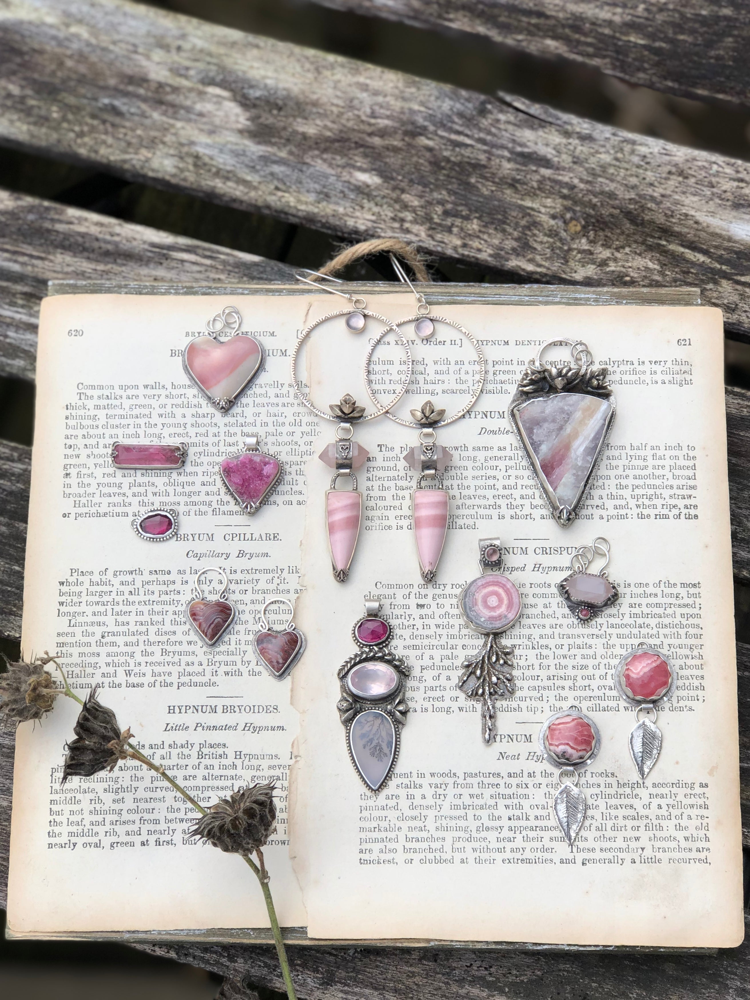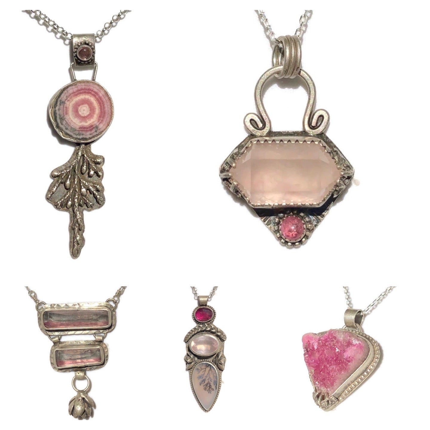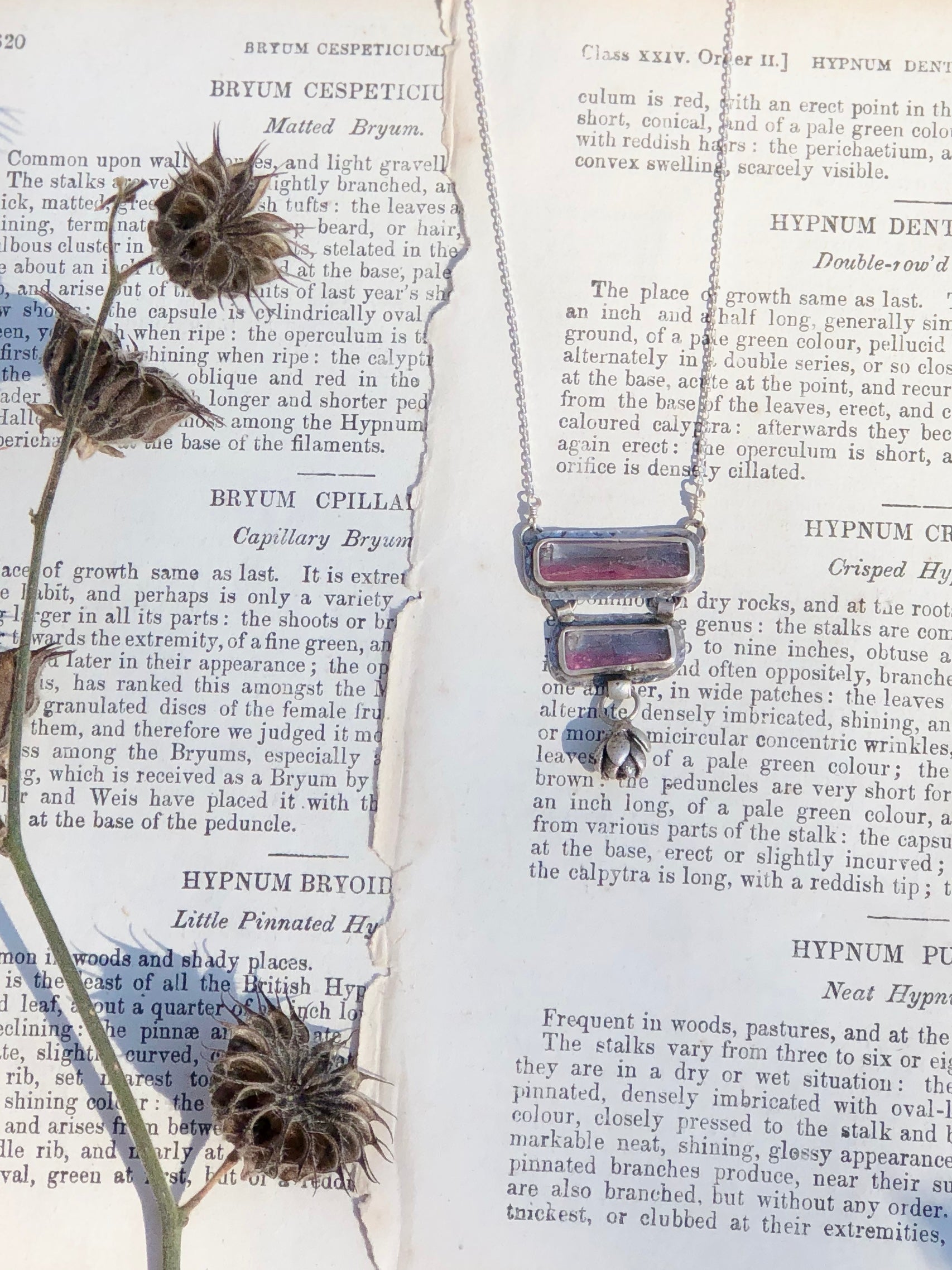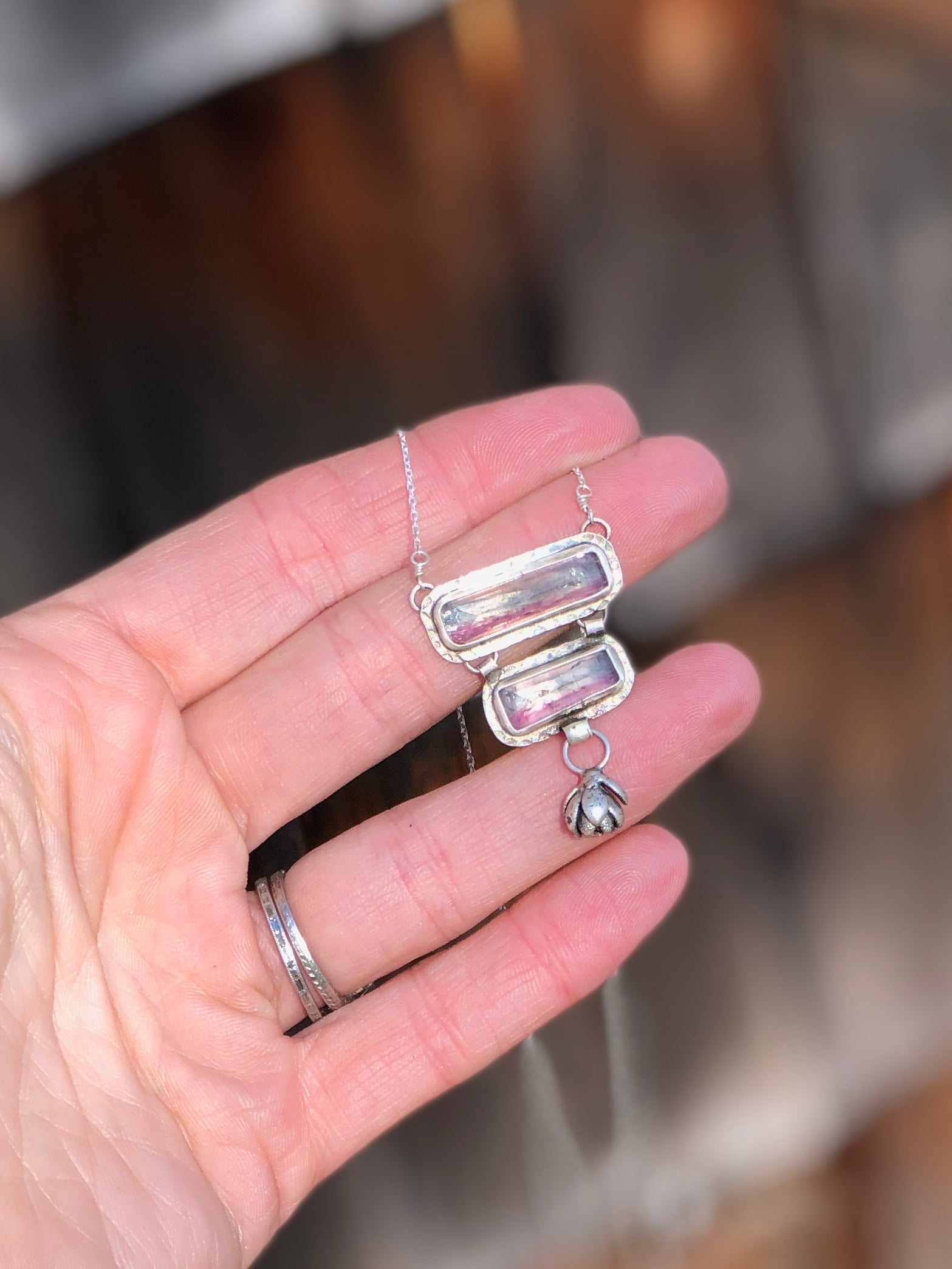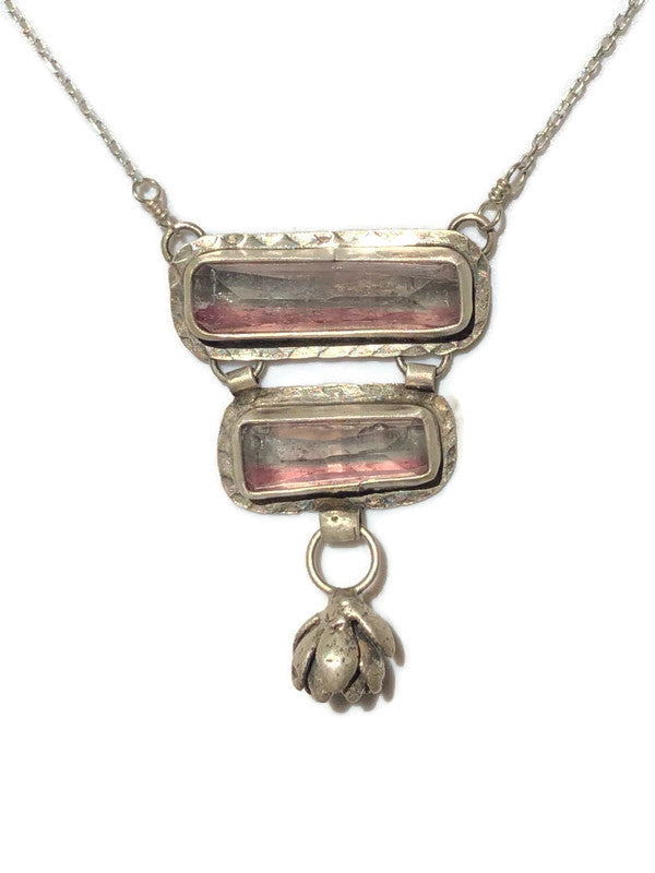 2 genuine faceted bi-color pink and blue tourmalines are set in fine and sterling silver with a textured border and are adorned with dangling sterling succulent casting. Finished on a sturdy but delicate diamond cut cable chain with a sterling lobster clasp. Completely one-of-a-kind from the Winter Rose Collection.