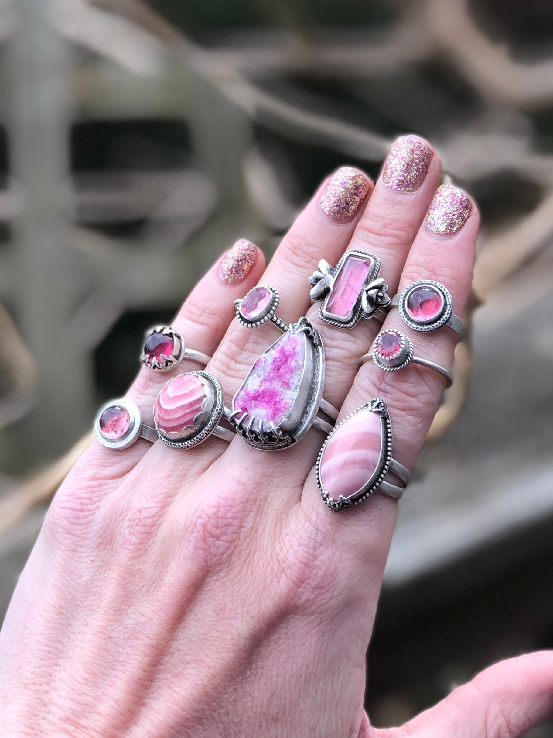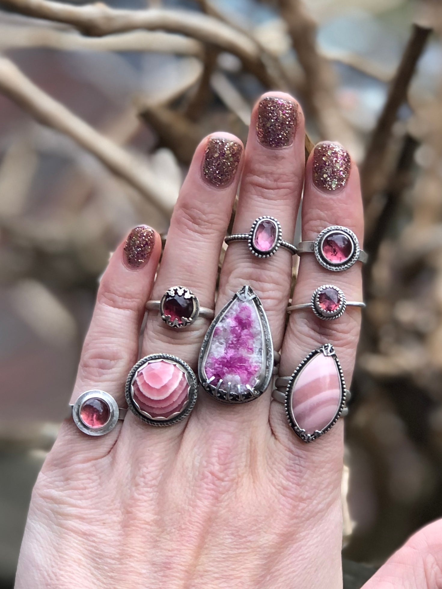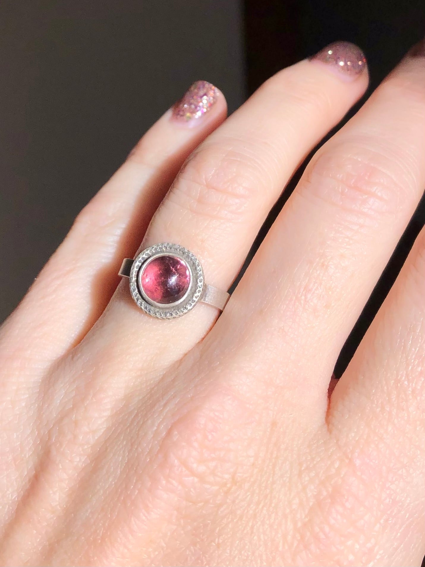 A beautiful and delectable round pink tourmaline is bezel set in fine silver with a border of sparkle wire for added flair. Finished on a solid sterling band size 5.25. Each ring purchase comes with one ring sizing. If you need a sizer, feel free to send us an email and we can mail one to you.