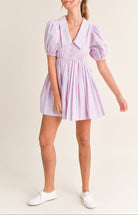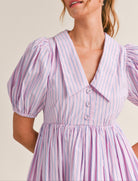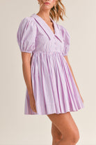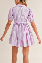 This pinstripe dress features short puff sleeves, a v-neck collared neckline, and a self tie and button front detail. The versatile tie can be styled in the front or the back, giving you different looks for any occasion. Made from high-quality materials, this dress offers both comfort and style.