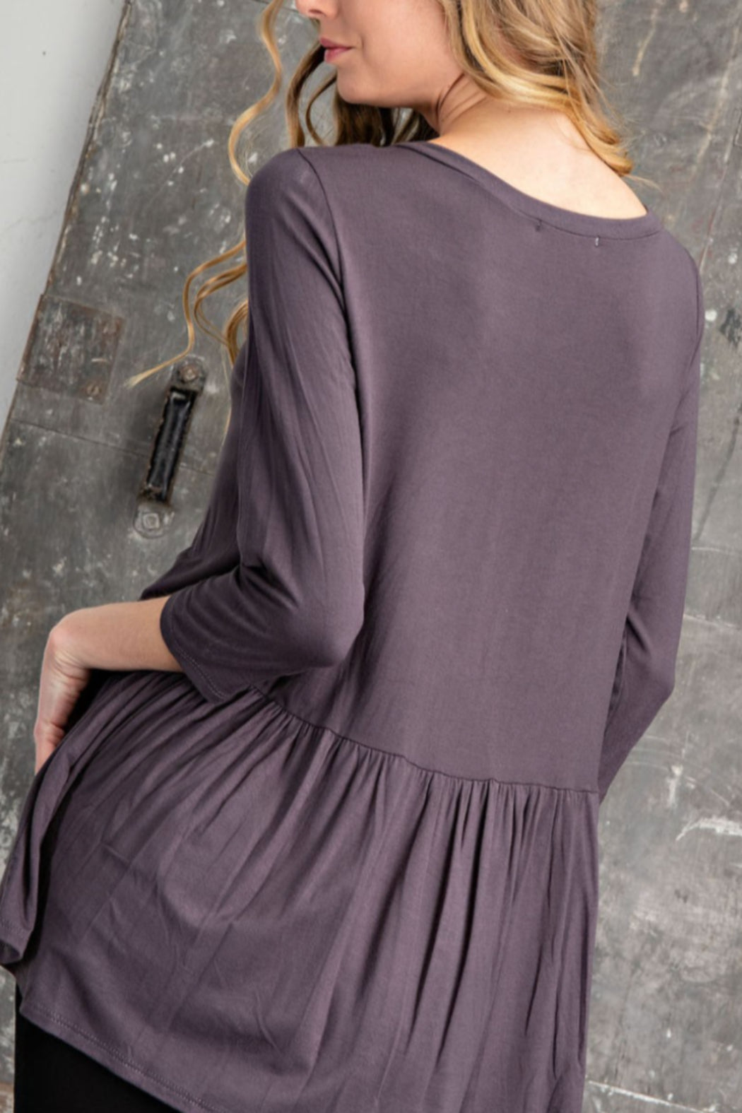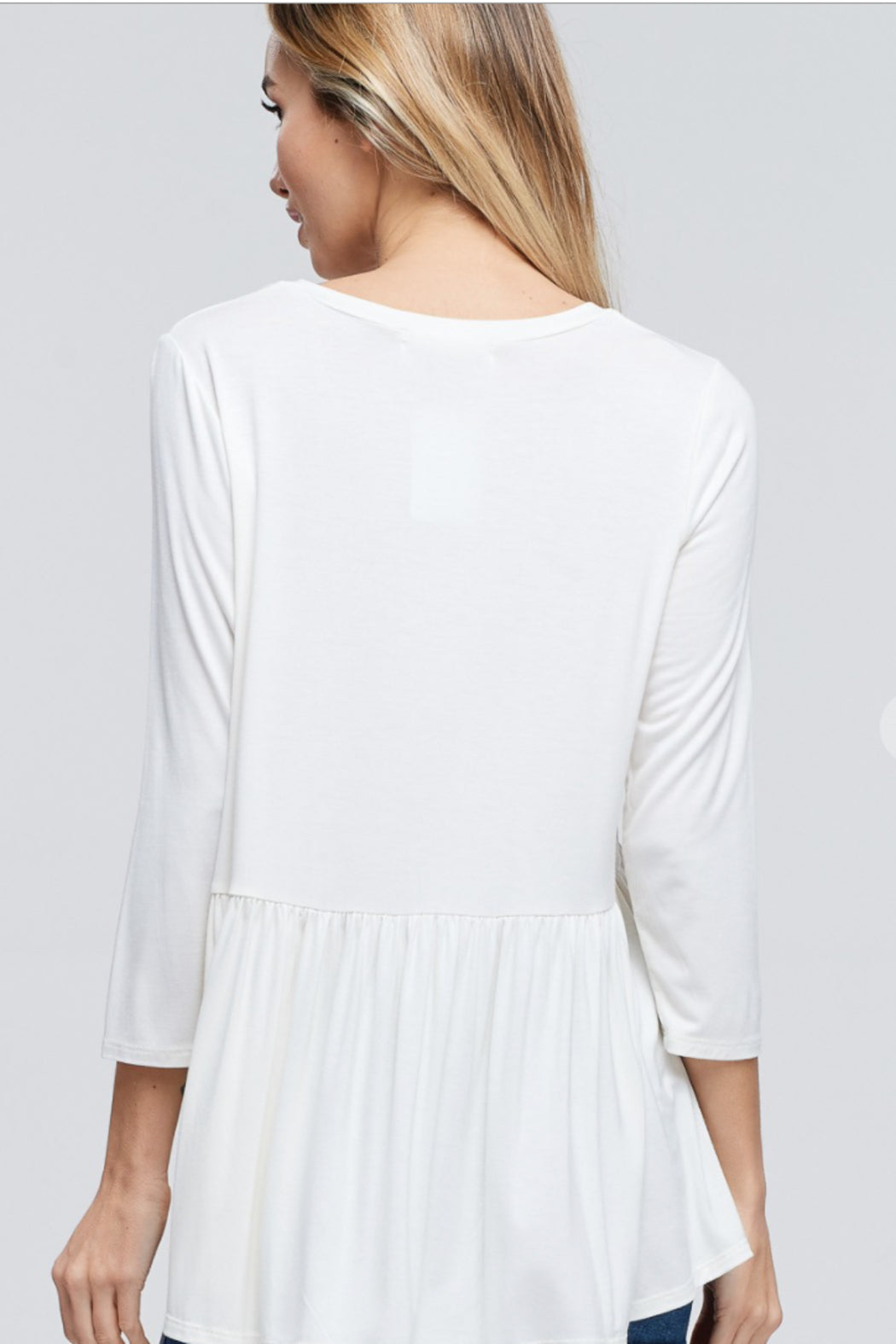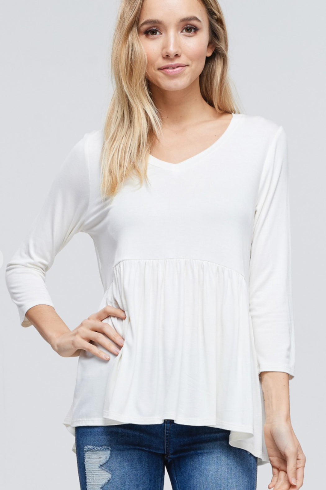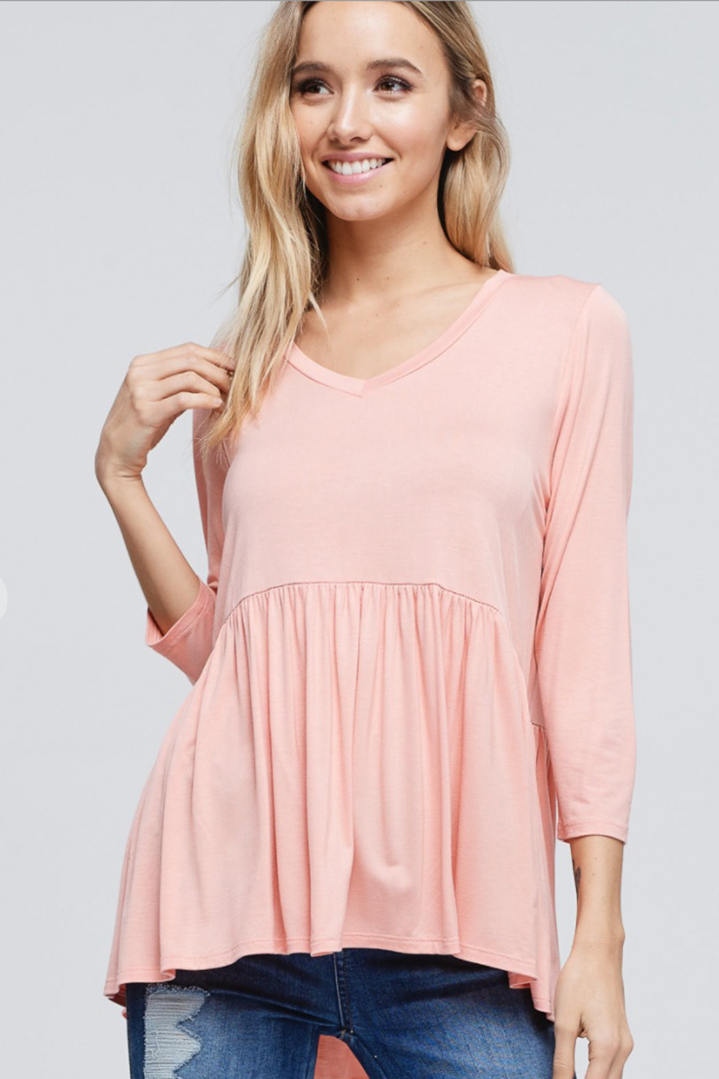 Three quarter sleeve v-neck peplum babydoll soft knit, causal jersey top