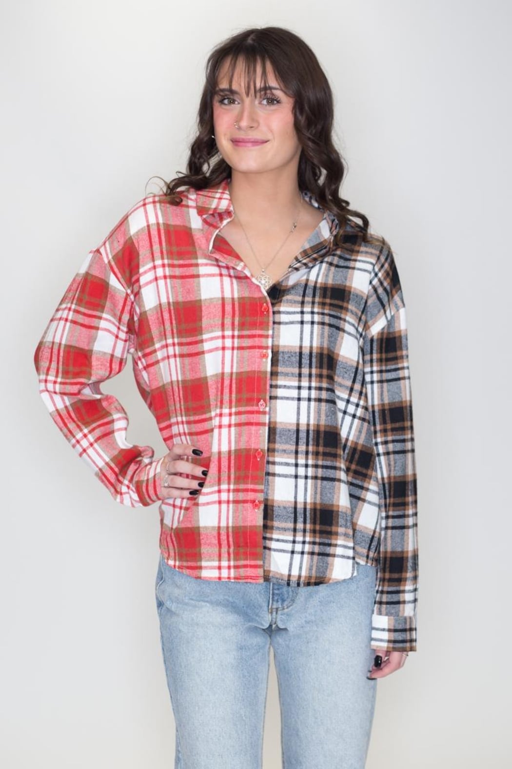 Long sleeve contrasting side by side plaid button down shirt.