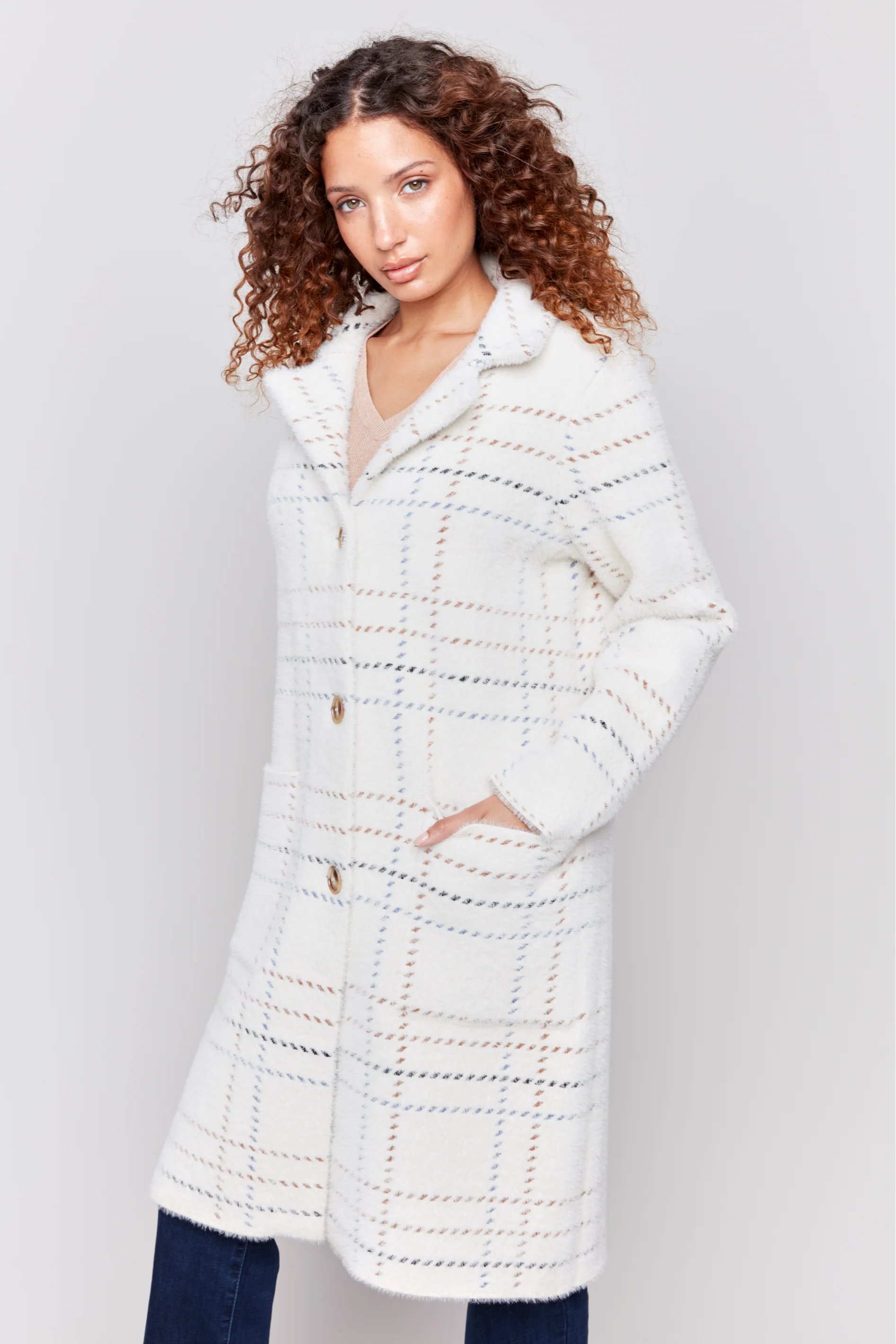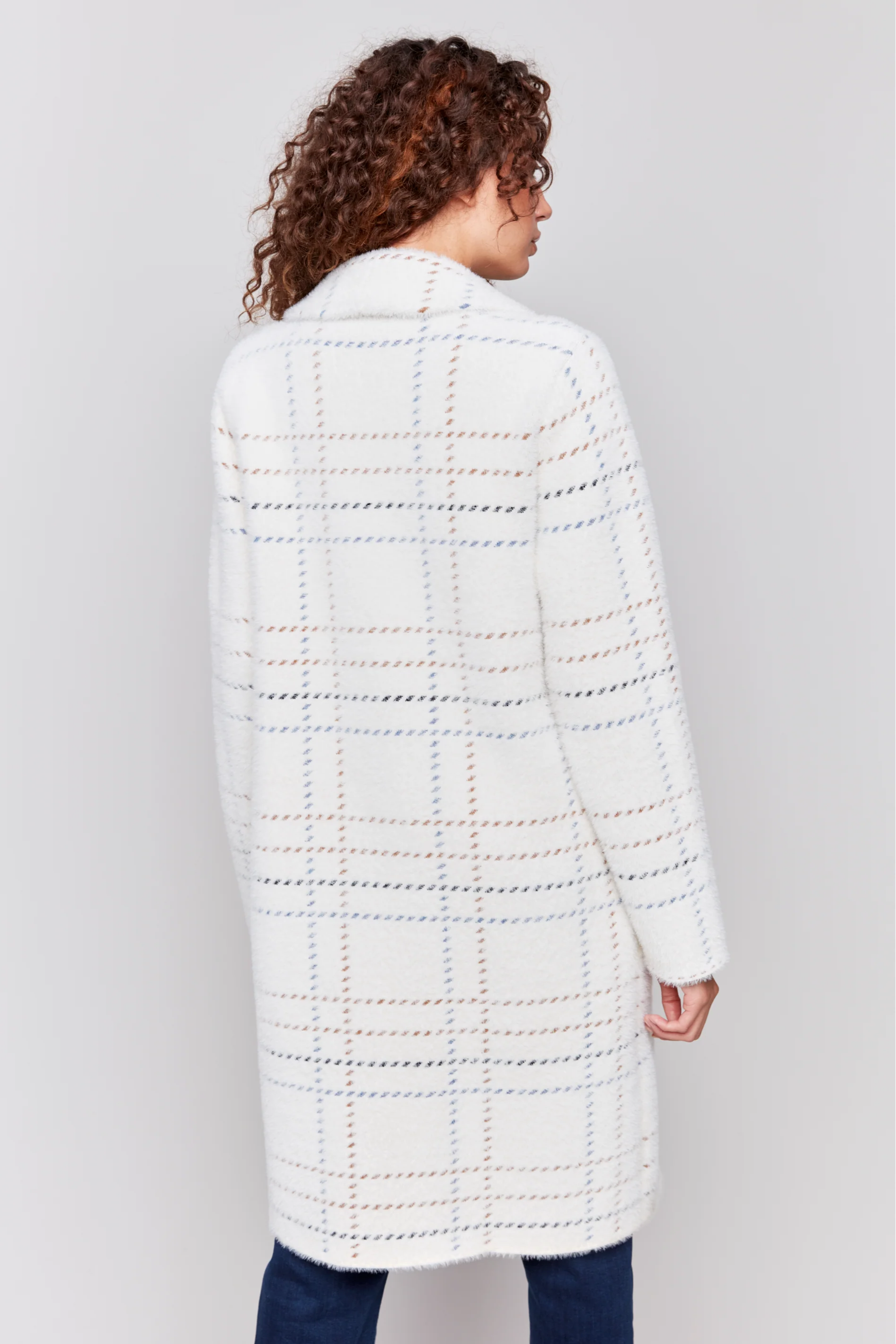 Light blue, dark blue and camel weave their way across this winter white coatigan by Charlie B. So cozy and striking with traditional features of a notch collar lapel, button front and two front pockets. Perfectly suited to dress up or down.