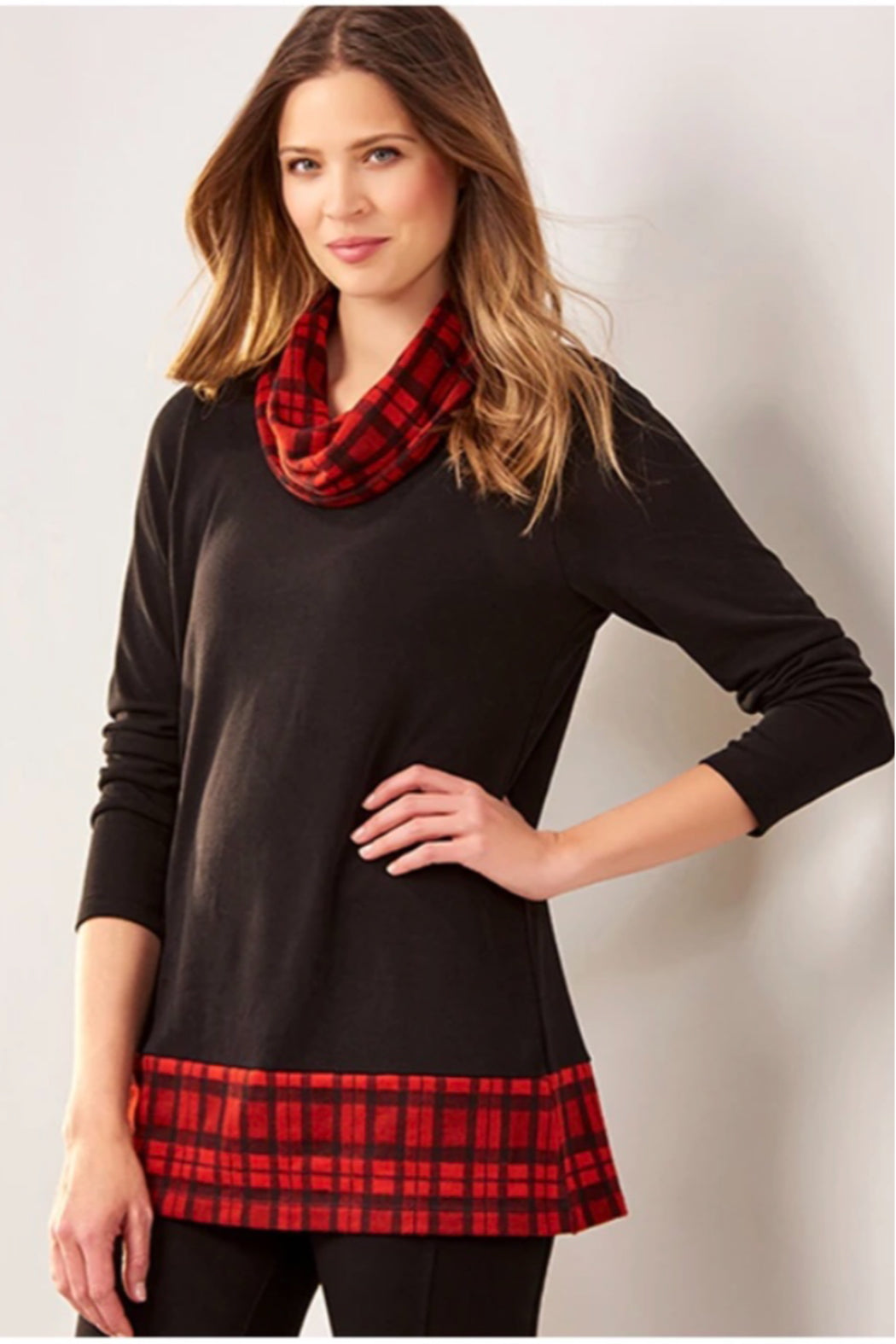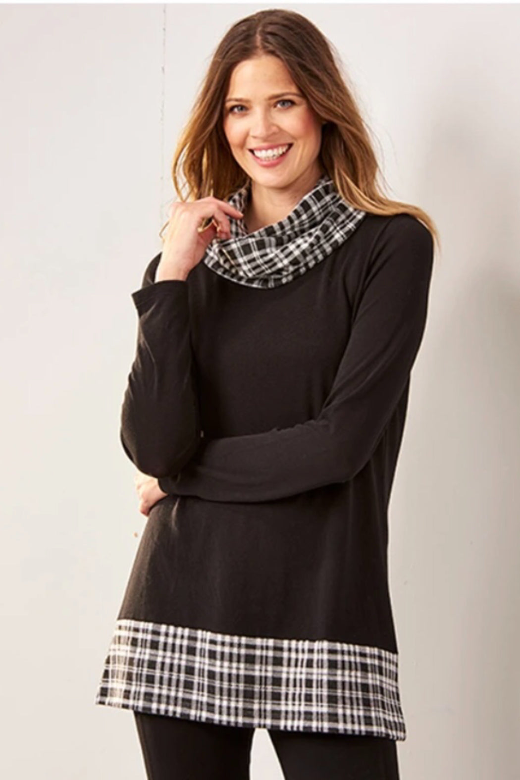 Get a layered look without the work with this black long-sleeve tunic designed with a plaid cowl neck and hem.