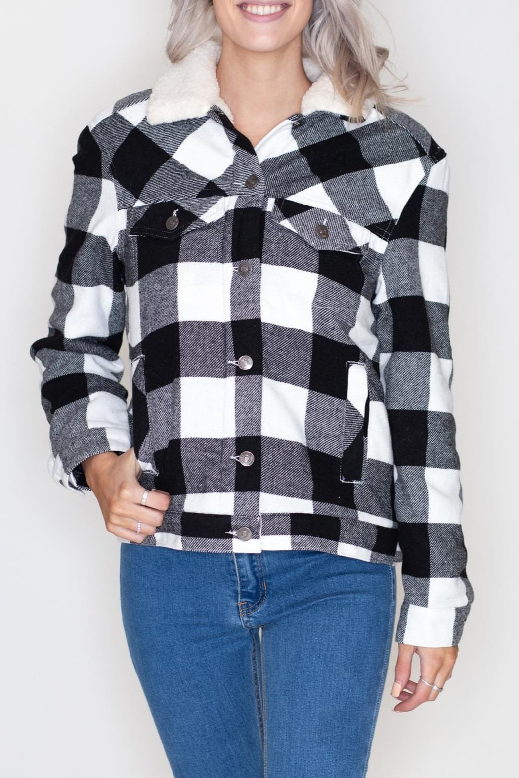Black and white checkered plaid jacket with button down front and faux fur lining.