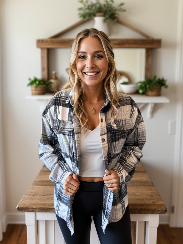Get ready to feel plaid-tastic in our Plaid Oversized Shacket! Made of soft woven fabric with a brushed texture, this printed shacket features an allover plaid design, relaxed oversized fit, dropped shoulders, notched collar, front chest pockets, and tortoise buttons. Perfectly paired with our crop tank tops and distressed jeans. Don't miss out on this easy everyday look!
