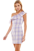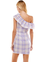 One shoulder plaid dress, featuring ruffles along the neckline and a fitted bottom half.