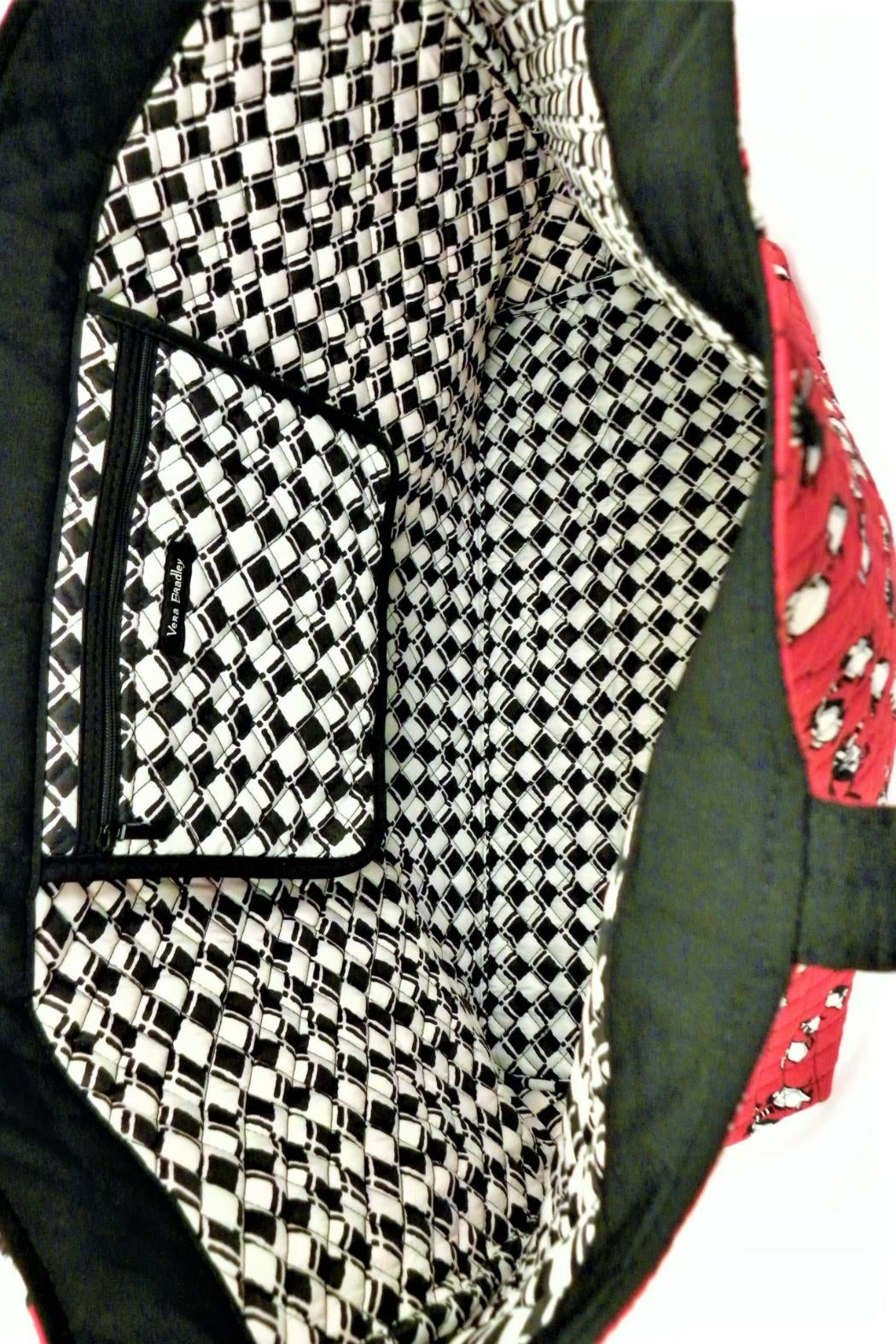 Here is the Vera Bradley Iconic Grand Tote in the Playful Penguins Red pattern. If you need a BIG tote, this is the one! And it is reversable! Classic quilted lightweight cotton with a red/white/and black penguin print on the outside, and a coordinating black and white diagonal check on the inside. One zip pocket on the inside with a swivel clip for keys. Find other bags and accessories in the Playful Penguins pattern on the "Mimi's Gift Gallery" boutique page. Dimensions: 17.5" long x 15" high x 7.5" wide with a 12.5" double strap drop.