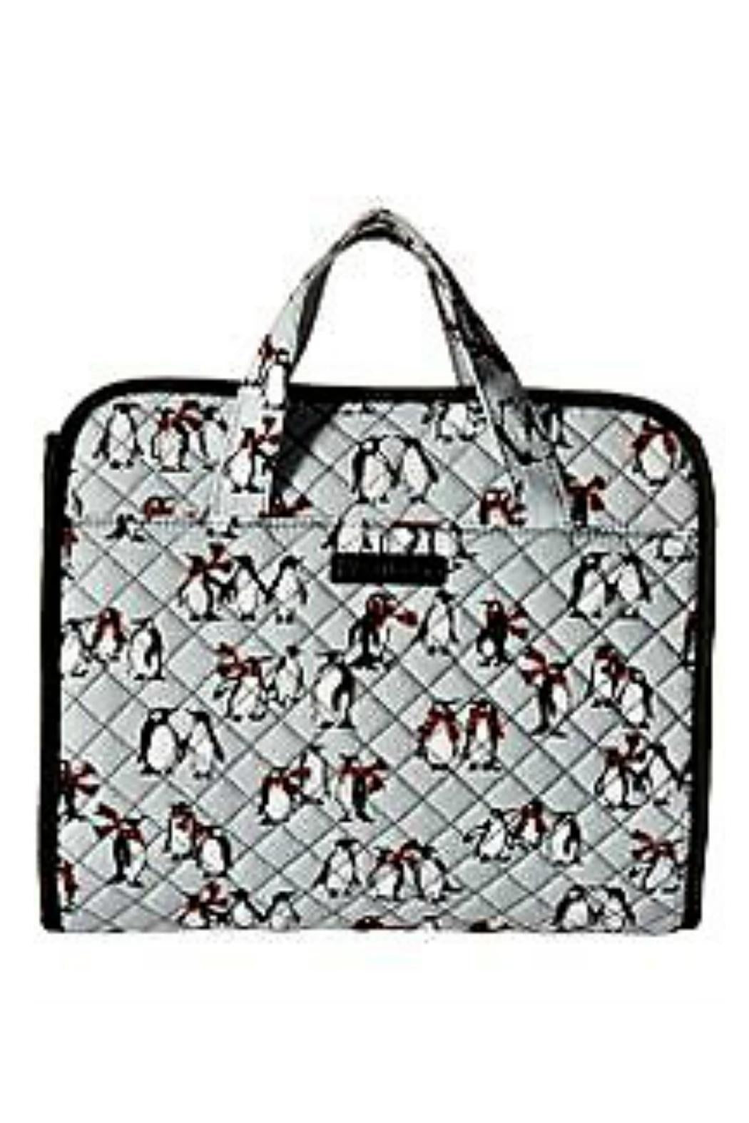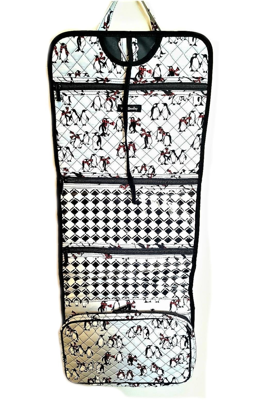 This is the Vera Bradley Hanging Organizer in the Playful Penguins pattern. A great place to stash al of your toiletries for anytime you are on the go. Top zip, quilted compartment plus two poly-lined, clear plastic compartments; gusseted, plastic-lined bottom compartment opens wide when unzipped. Folds ever so neatly with with an easy tie closure at the top with double carry handles. Wipe clean with damp cloth. Find other Vera Bradley Playful Penguins accessories on the Mimi's Gift Gallery boutique page. ------- Dimensions are 11 ½" wide x 29 ¼" high x 2 ½" deep with 4 ½" handle drop.