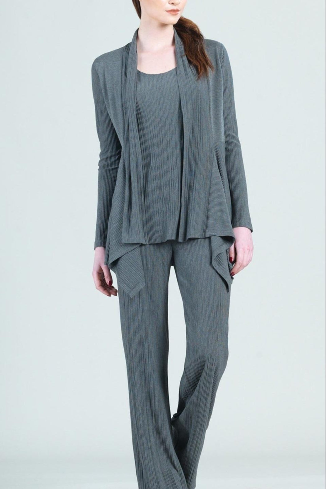 You can not pass up on this twinset! It is a beautiful charcoal color that pairs nicely with any color of pant. You can wear the twinset together or mix it up and put a different color shirt under the cardigan or a different cardigan over the tank top. This is nice travel friendly fabric as well.