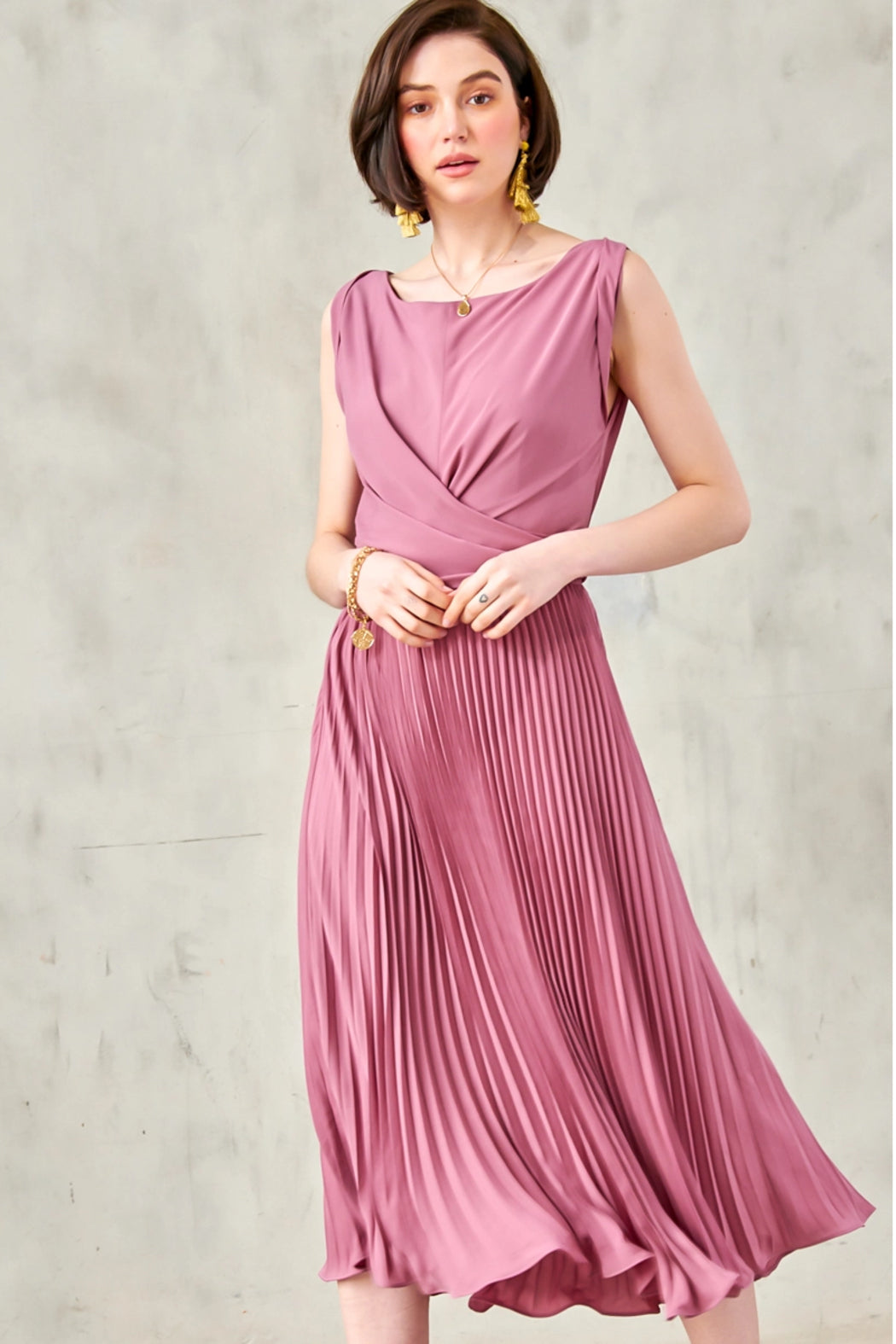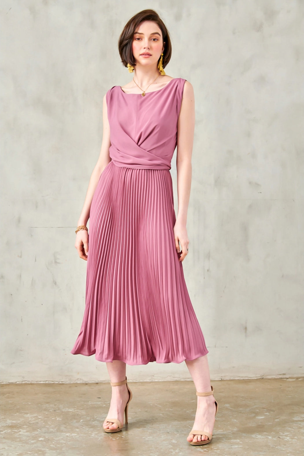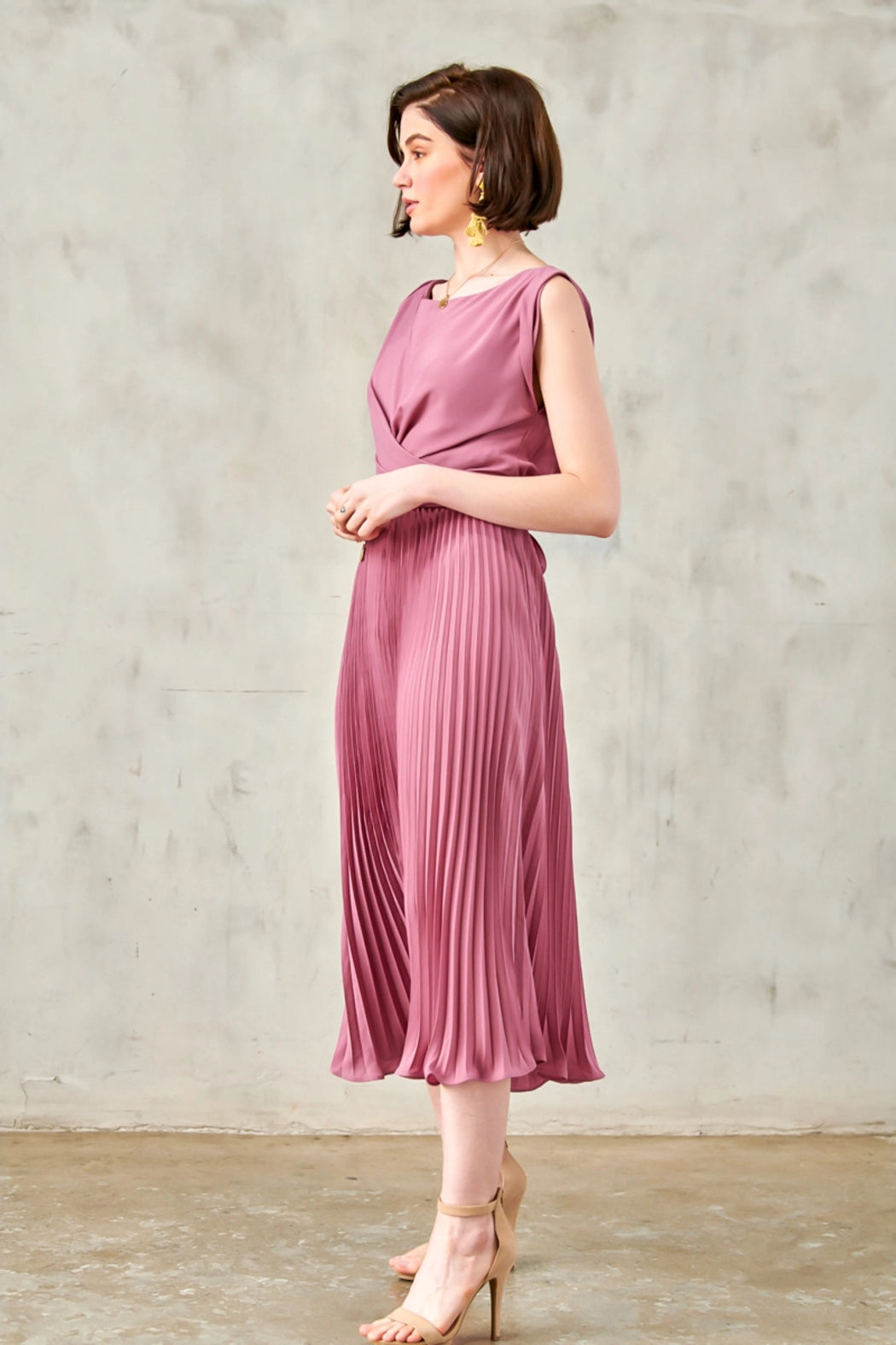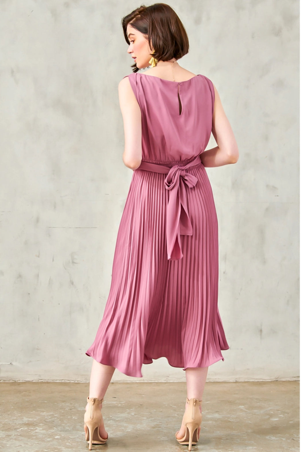 Looking for a classy and effortless look dress to wear at your important event or for your date?! Look no more, this gorgeous dress is the perfect one! It features a beautiful pink marsala color, a front wrap style with a self tie on back, pleated flowy bottom skirt, scoop neckline with a back button closure, cinch stretchable waistline, midi length, fit and relaxed bodice style, fully lined, chiffon material has some stretch. Pair it with your favorite heels and go to gold accessories for the perfect event look! Model wears size Small L: 50" B: 38"
