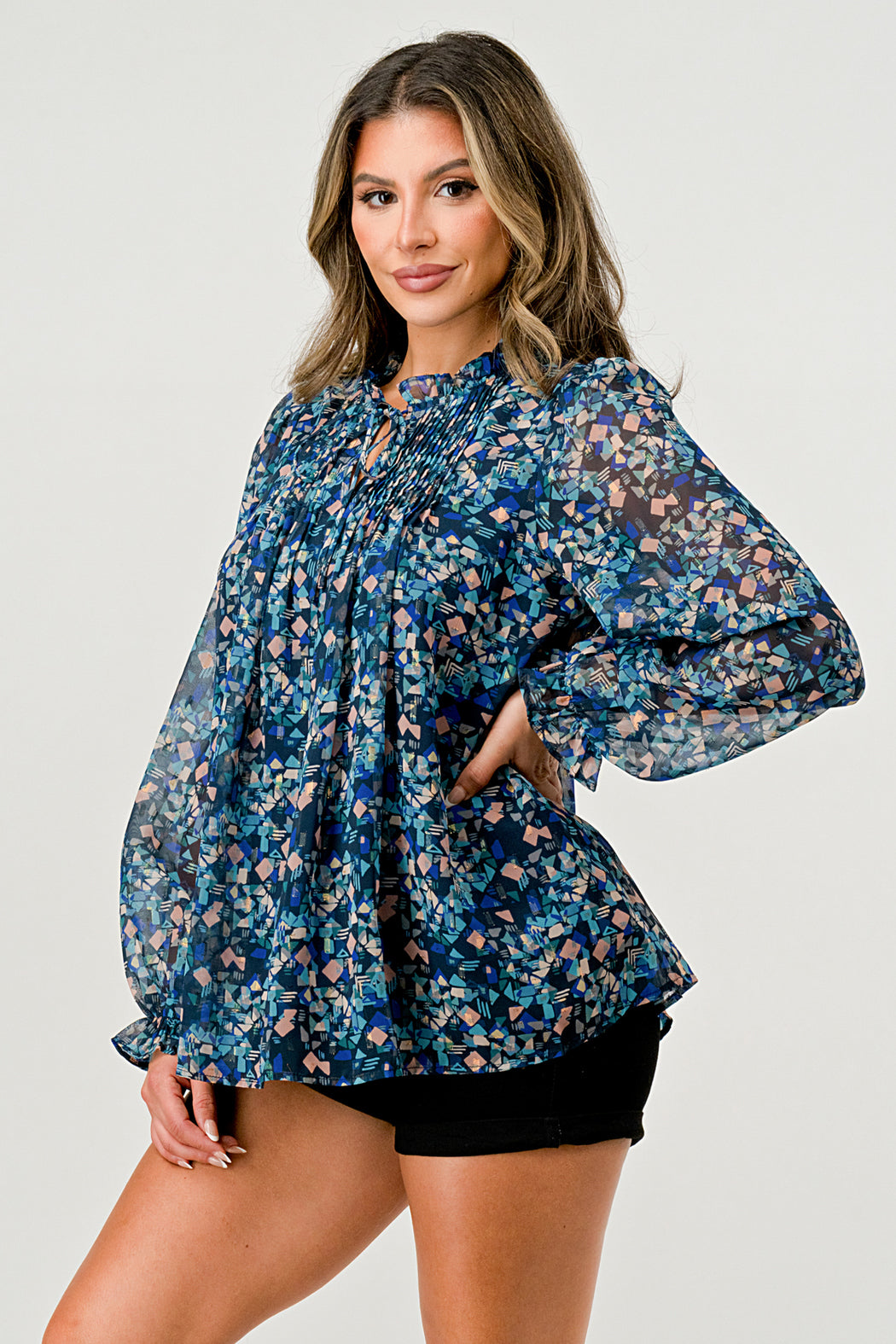 Pleats detail long sleeve pop over blouse in floral chiffon