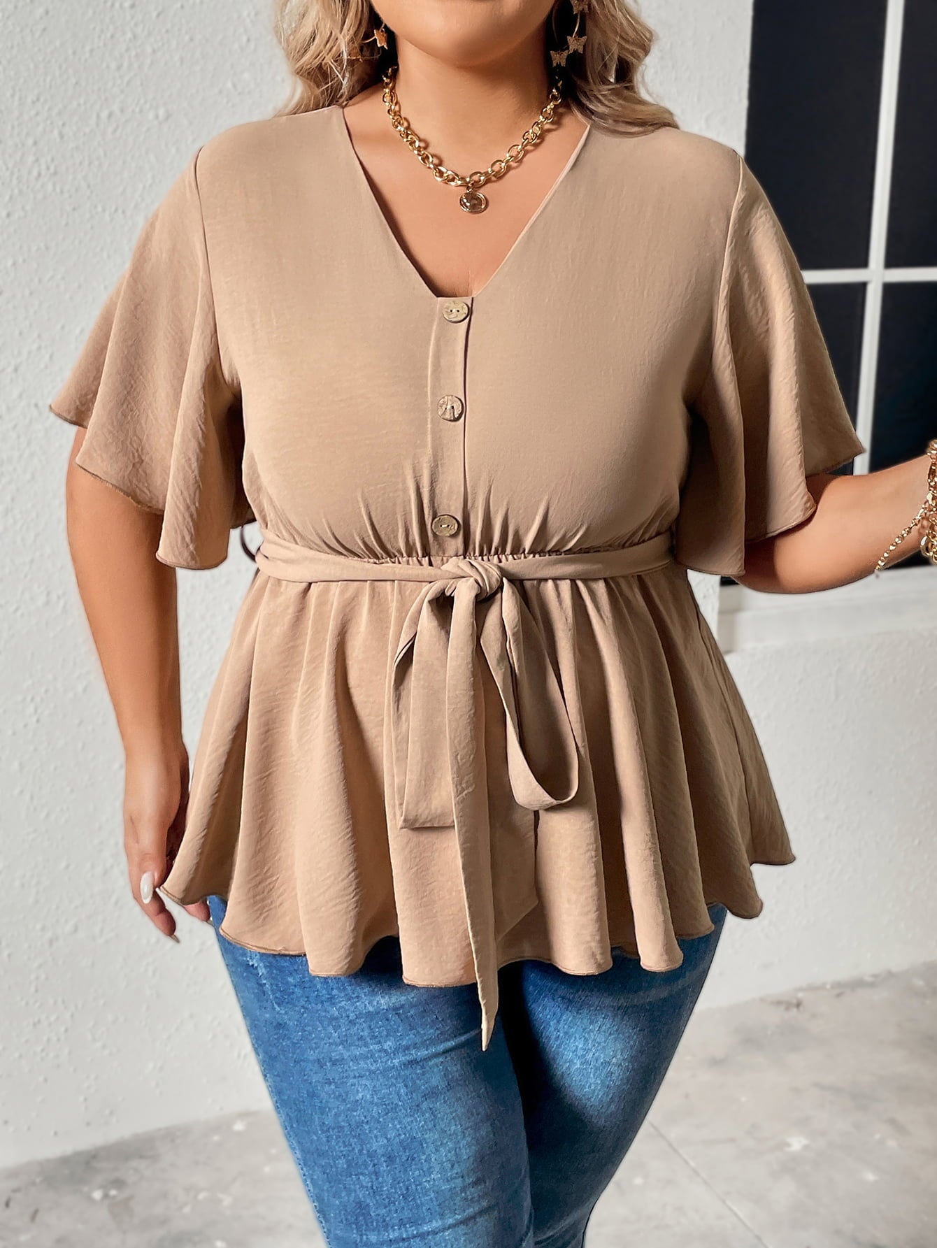 Plus Size Buttoned Tie Waistband Flutter Sleeve Blouse