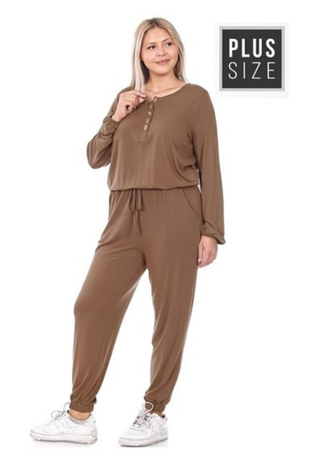 Plus Size Jumpsuit - Relaxed Fit - With Pockets - Long Sleeves - Mocha