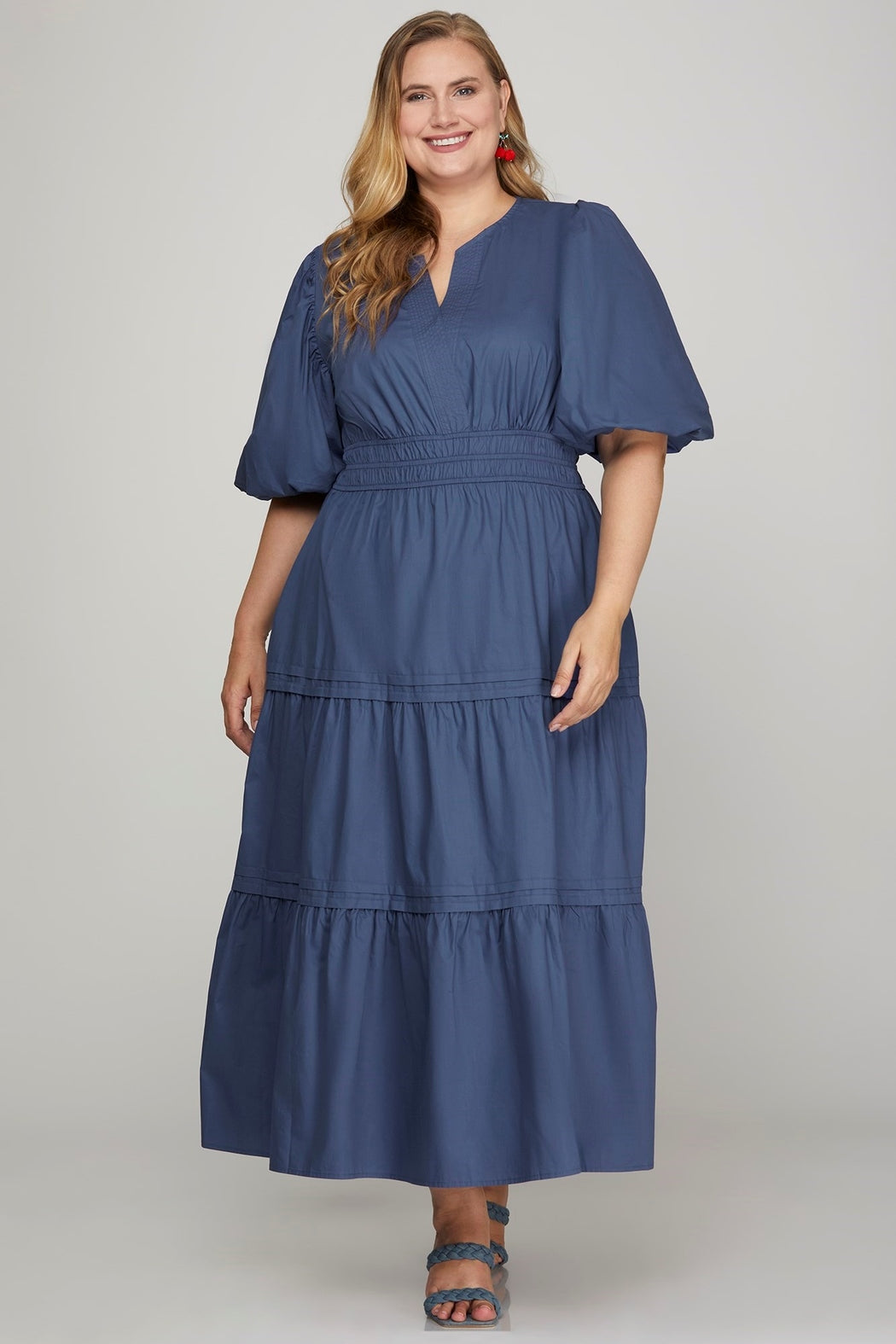 This is a cute balloon half sleeve poplin woven v-neck tiered midi dress. It is the perfect navy color that almost looks like denim. This dress has a smocked waistline that makes it comfortable to wear all day long and the best part is that it has pockets!