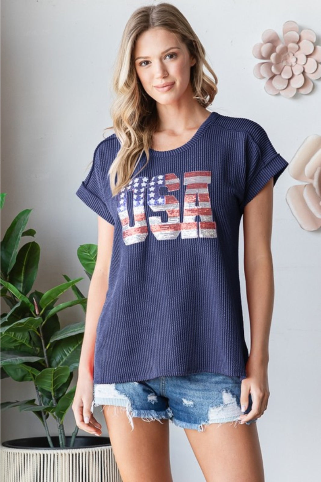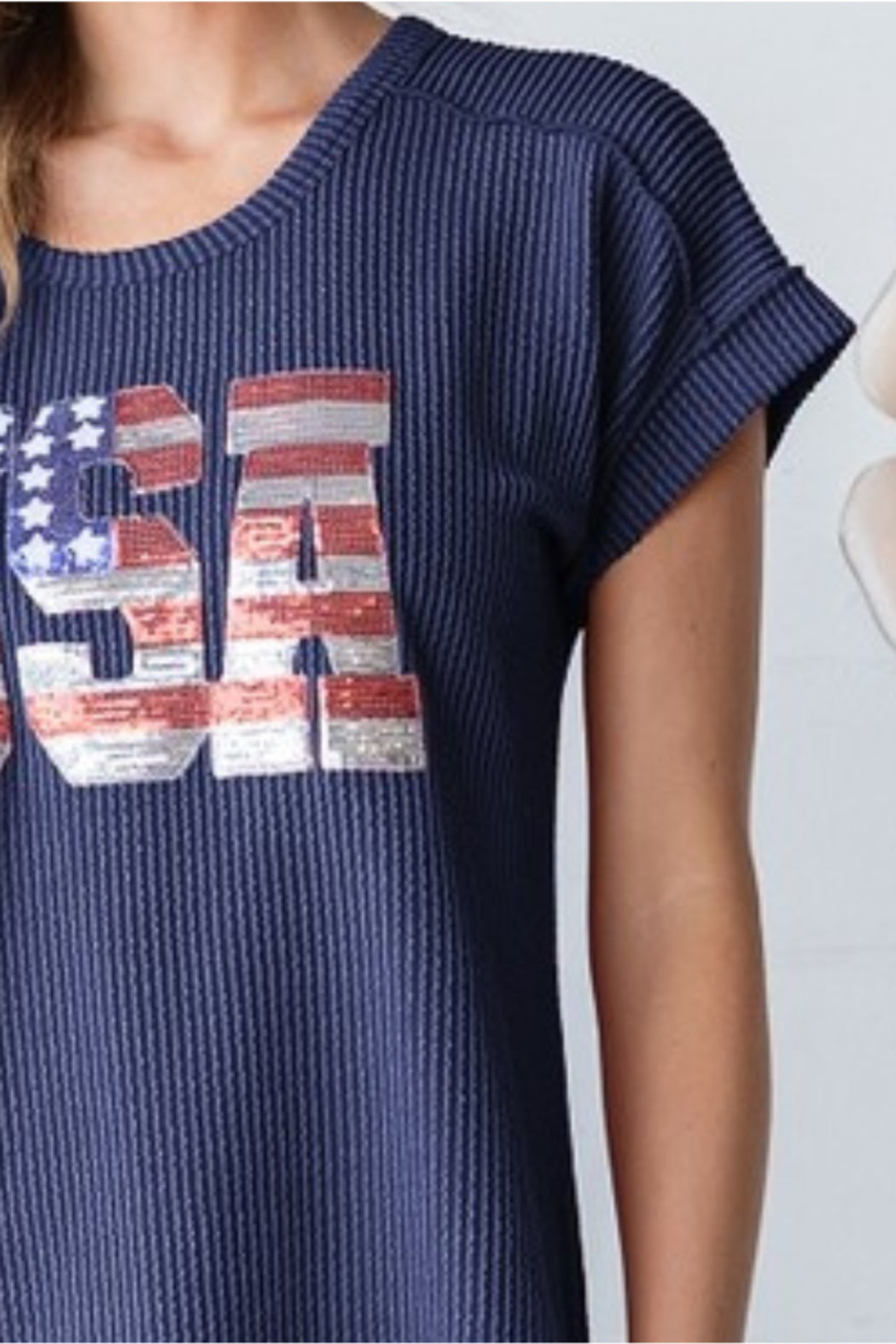 Plus Solid Urban Ribb Top with USA Sequins Patch