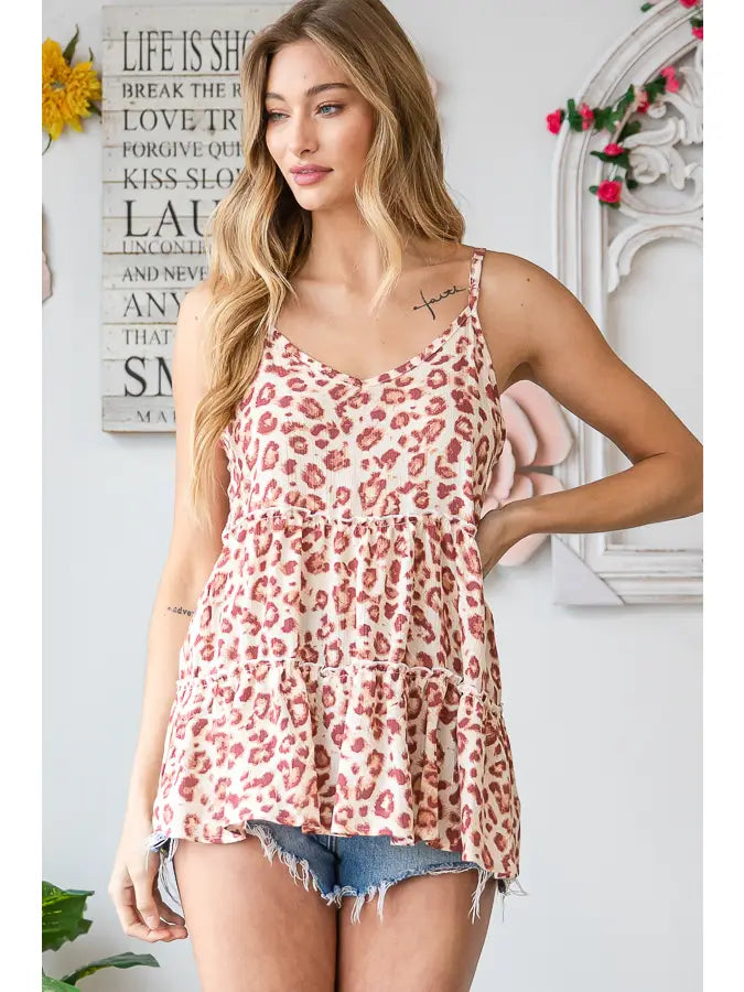 Embrace your wild side with this chic animal print spaghetti strap top! Featuring a unique color block design and a flattering babydoll silhouette, this top will make a statement and turn heads wherever you go!