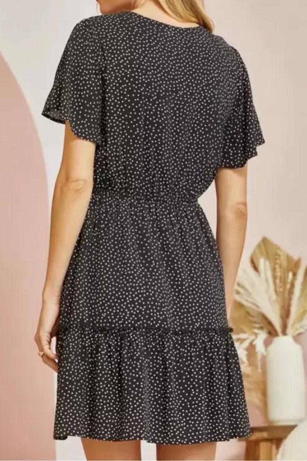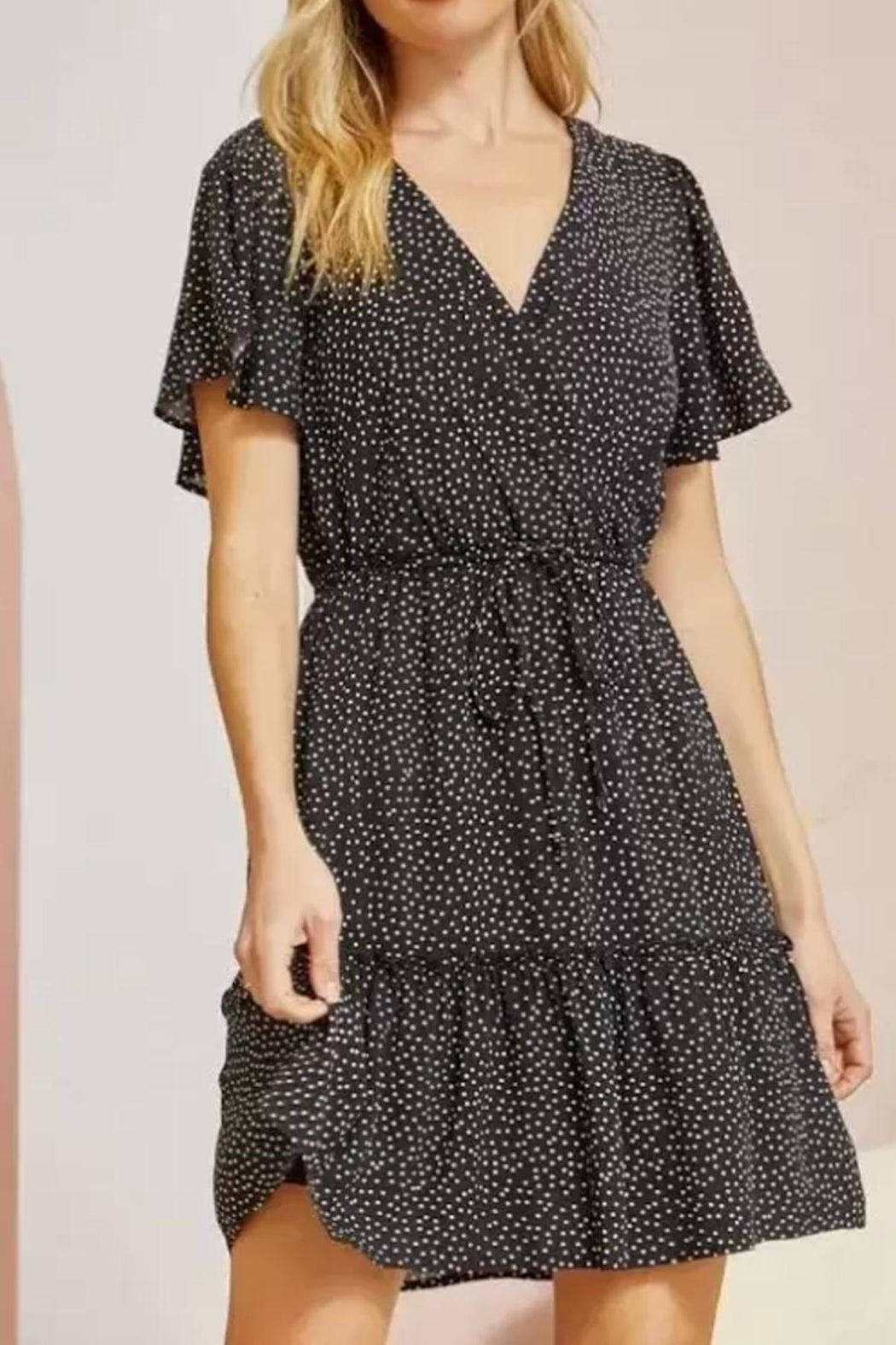 Polka dot half sleeve surprise wrap style dress with elastic waistline. Fully lined, non sheer