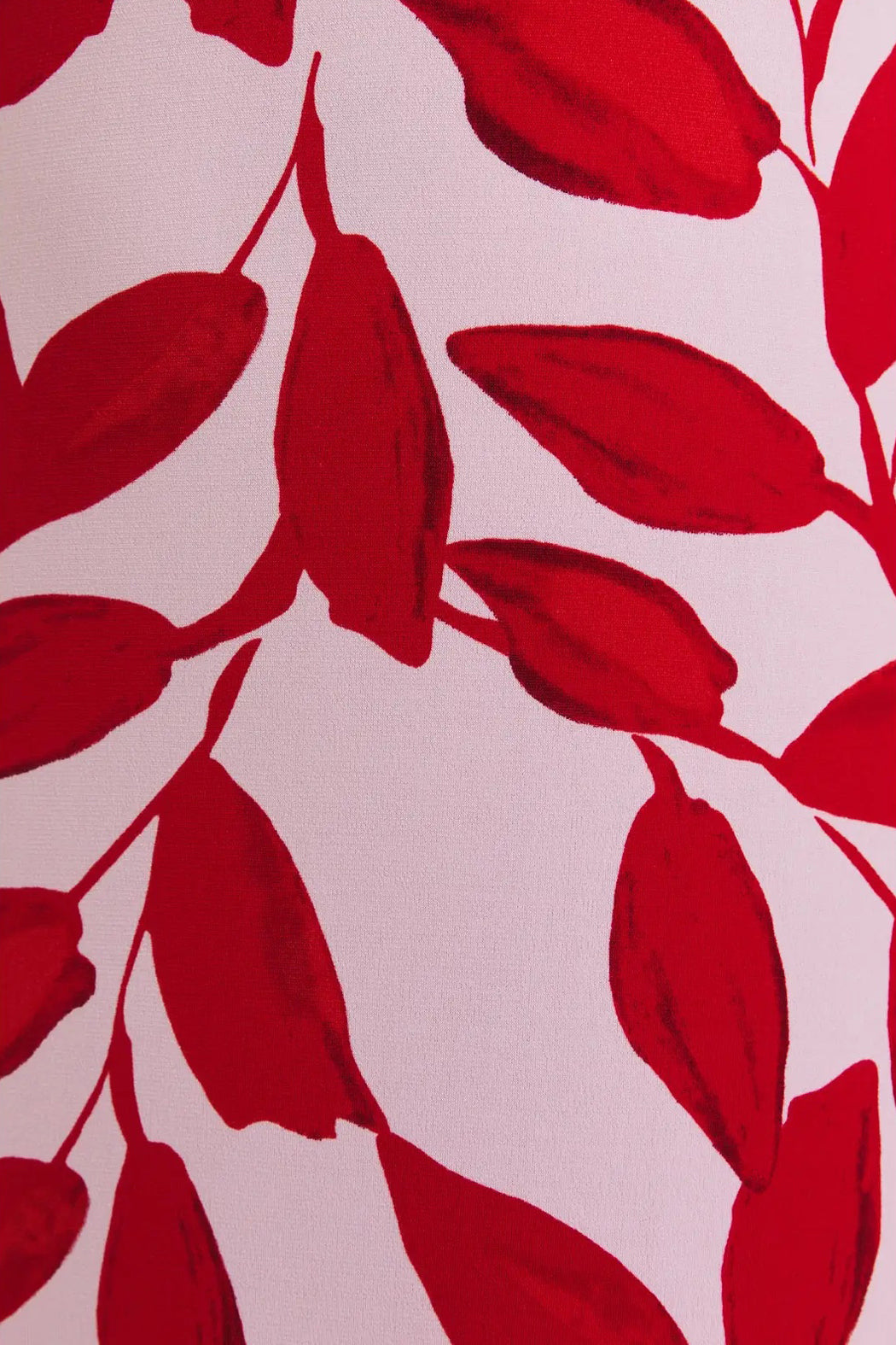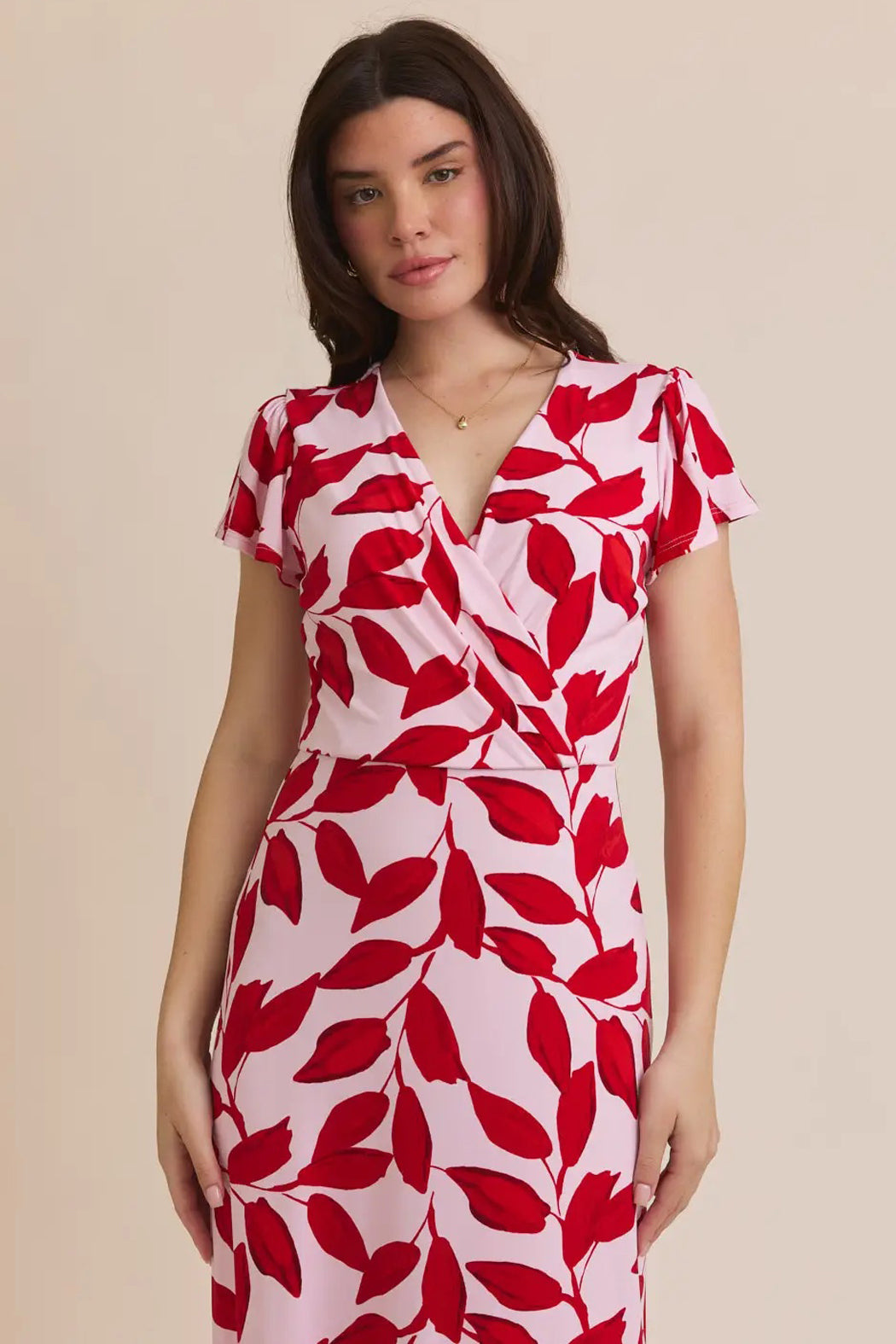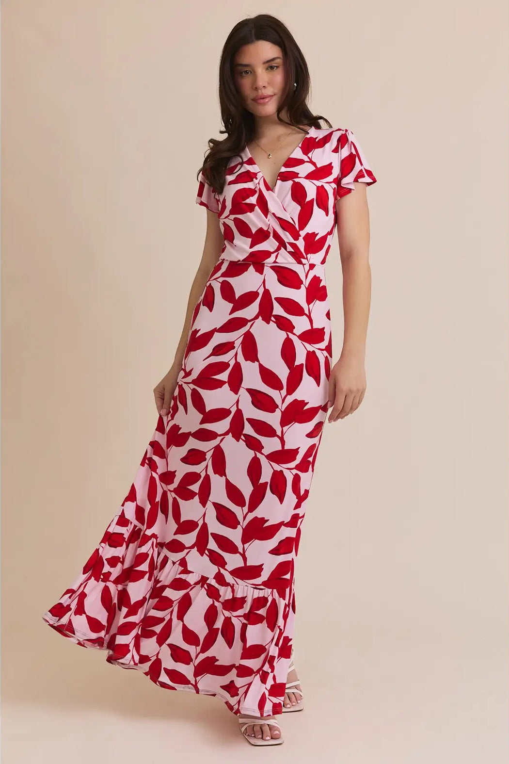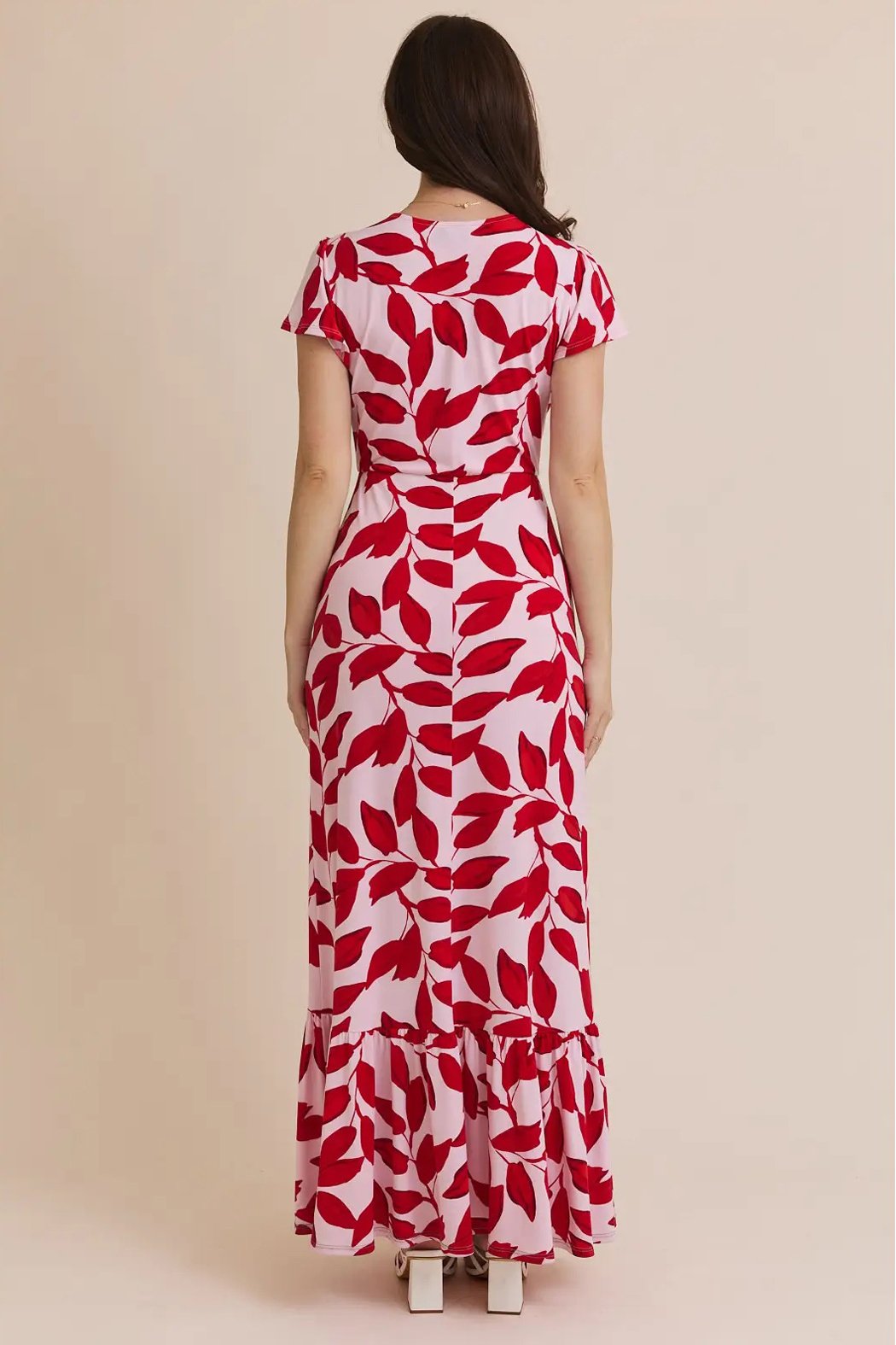 Made from an ultra stretchy and soft surplice material, this bold printed maxi dress in pink and red features a crossing v-neckline, ruffle sleeve, and hemline ruffle. Perfect for any occasion from a dinner date to a wedding.