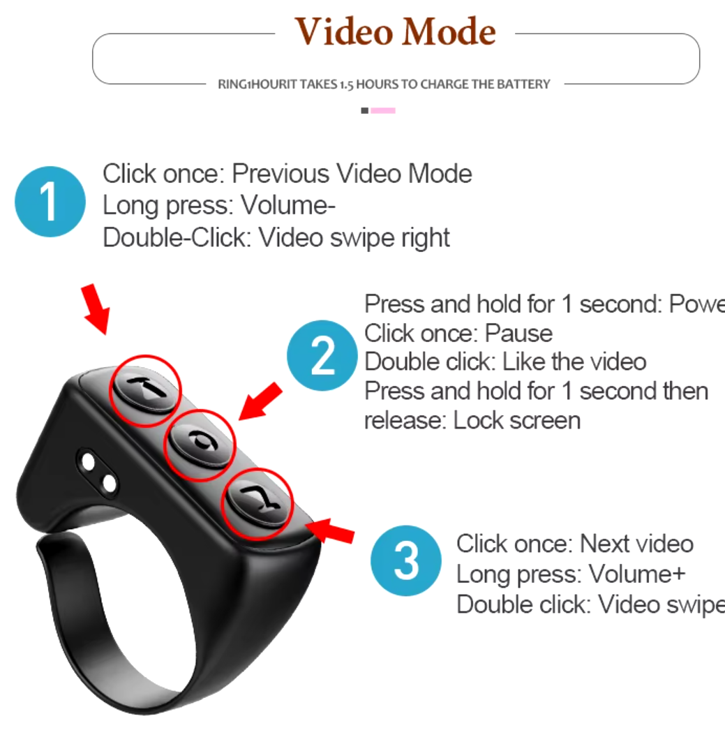 Cell Phone Camera Bluetooth Remote: You can use it to take pictures and record videos In photo or video recording mode on your phone, just long press either button up or down on the ring within a distance of 10 meters